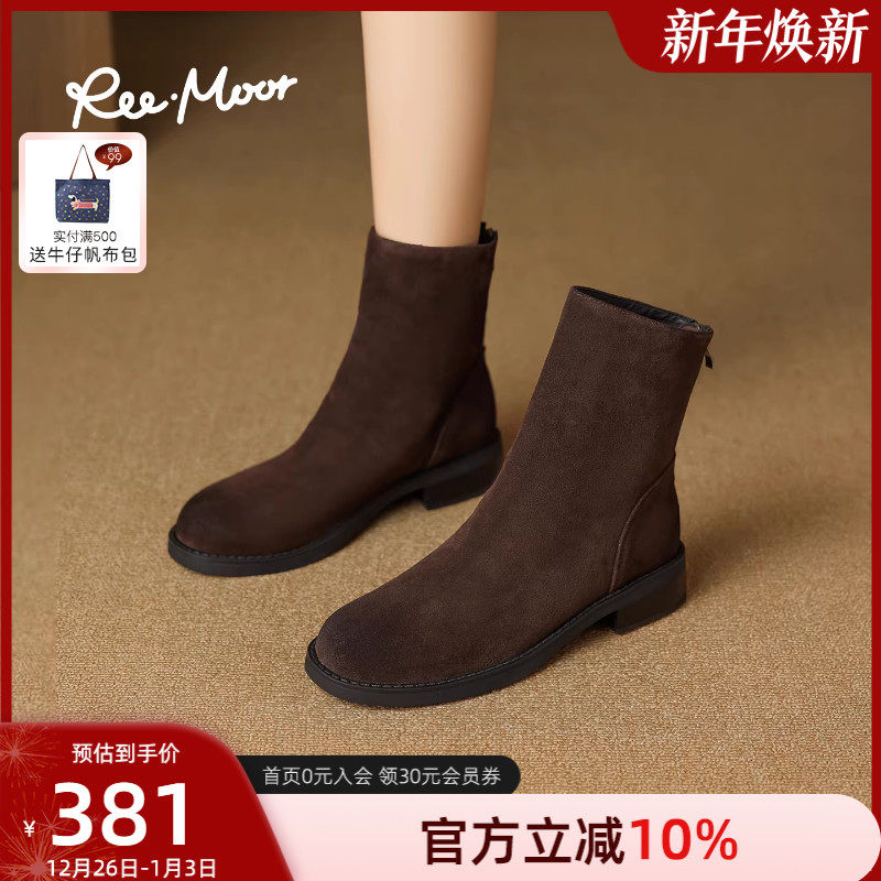 REEMOOR睿慕2025冬季新款复古英伦风圆头粗跟增高加绒切尔西靴女