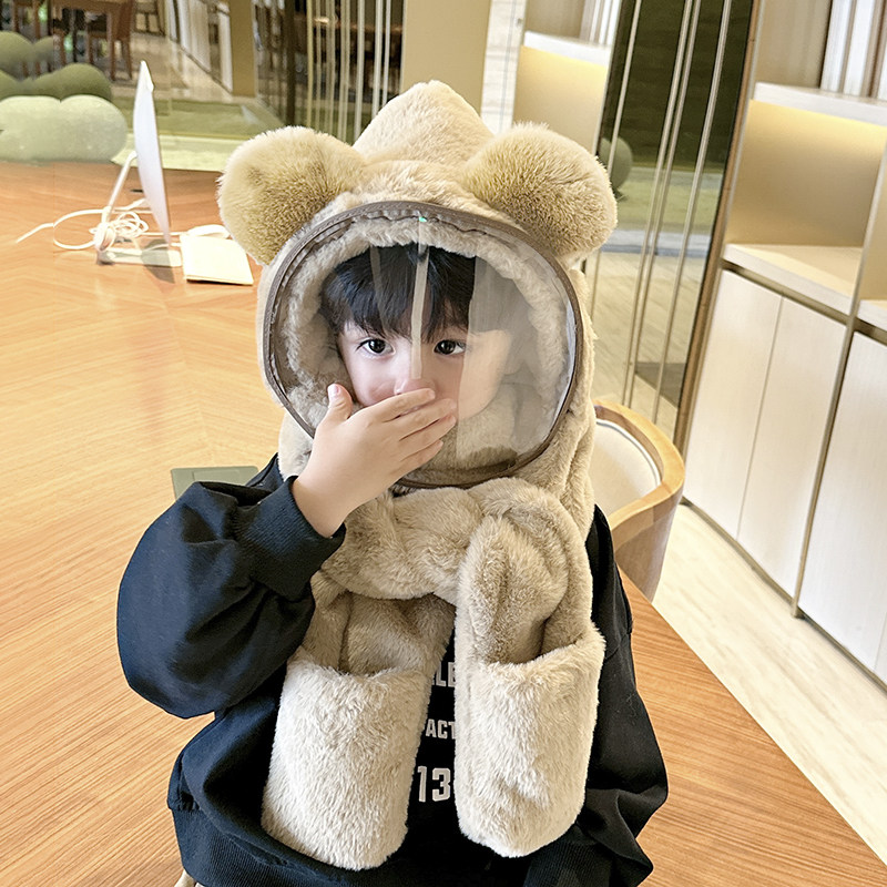 宝宝帽子冬骑行保暖毛绒帽男女童防护面罩儿童围巾手套一体帽防风