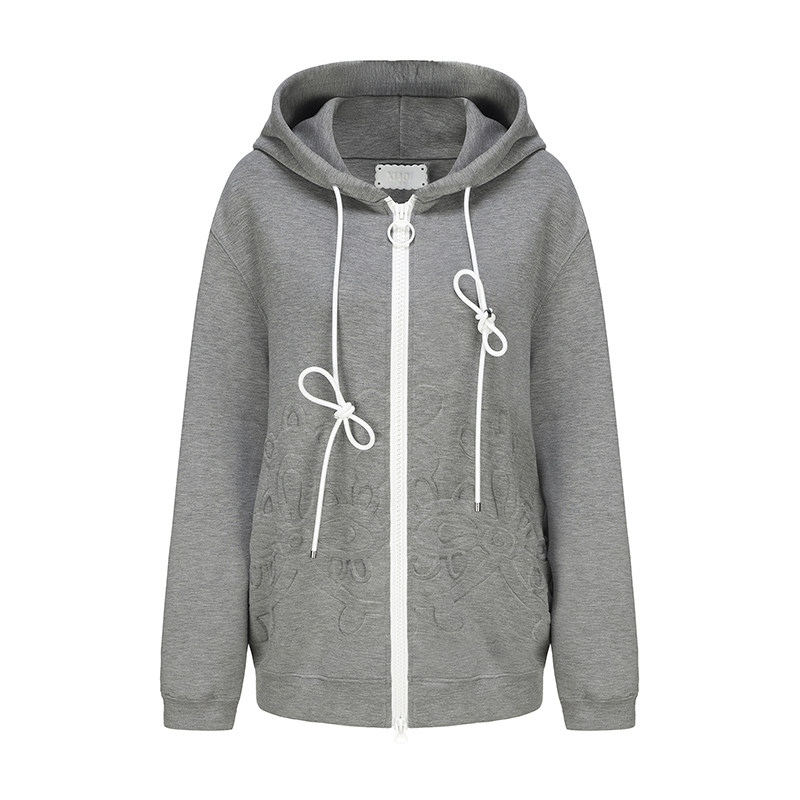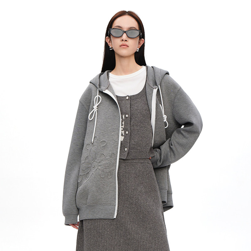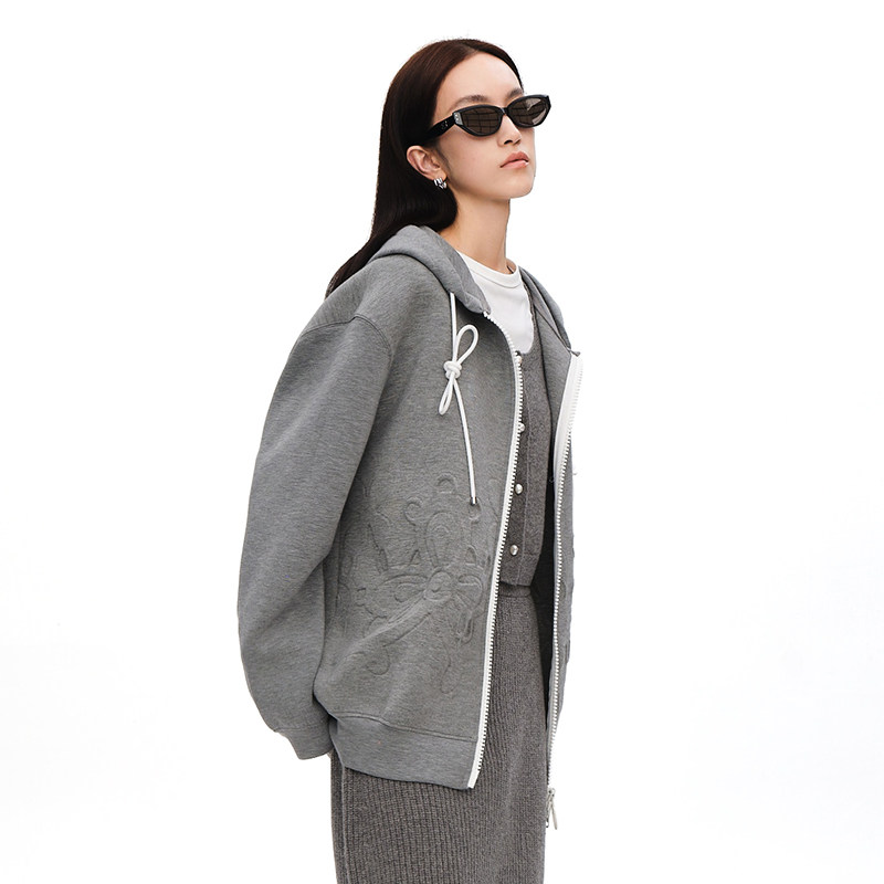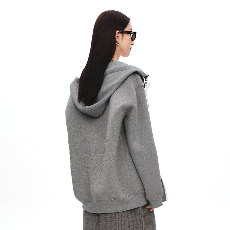 XIAOLI筱李设计师款立体压花空气层格雷系连帽开衫卫衣灰色