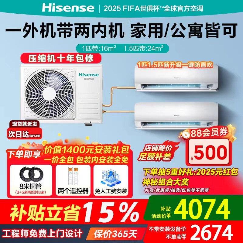 海信一拖二空调挂机1匹1.5匹2匹卧室家用变频中央空调-泰吉