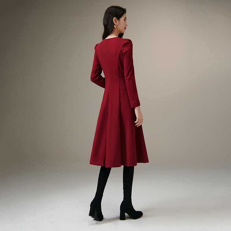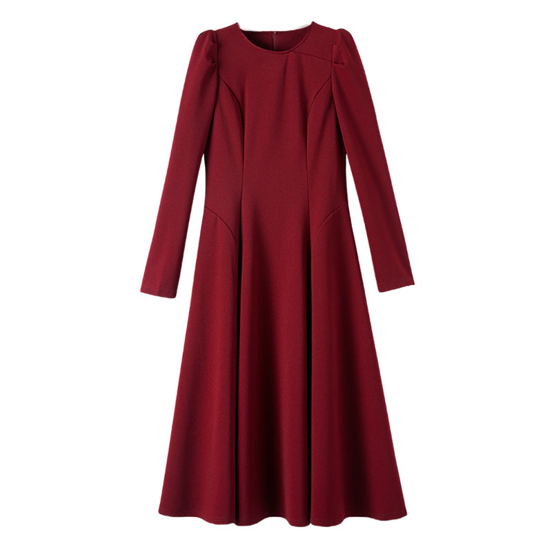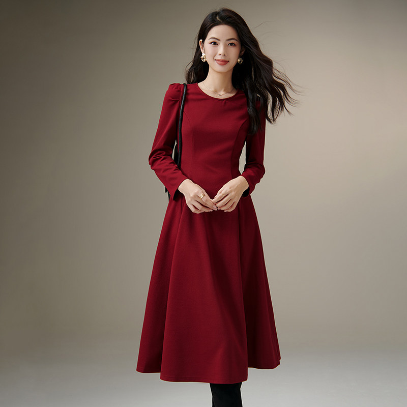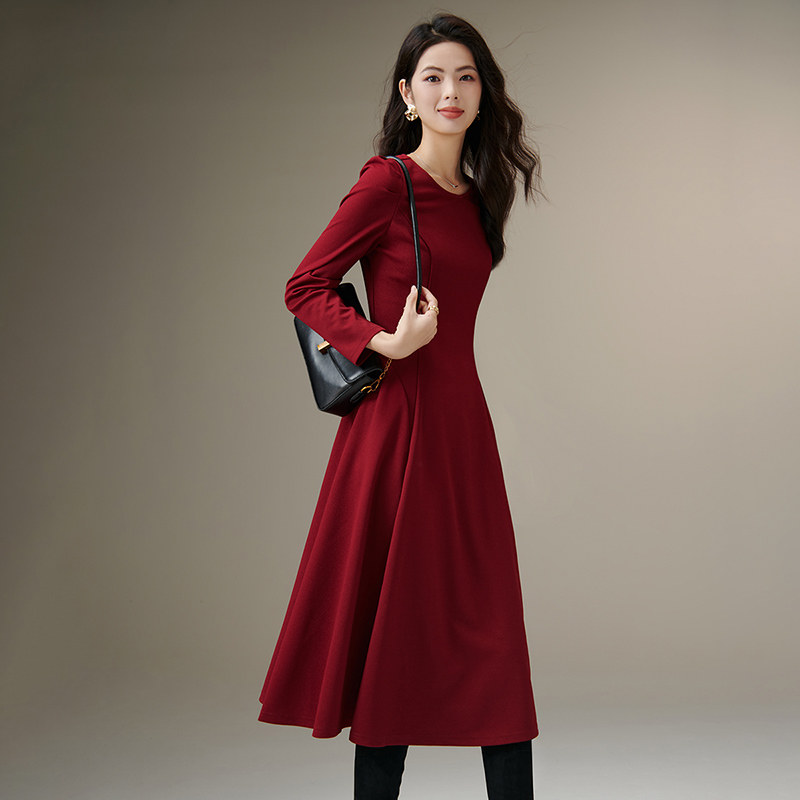 晚白2025年秋冬新款圆领新年圣诞红色裙子修身收腰气质长袖连衣裙