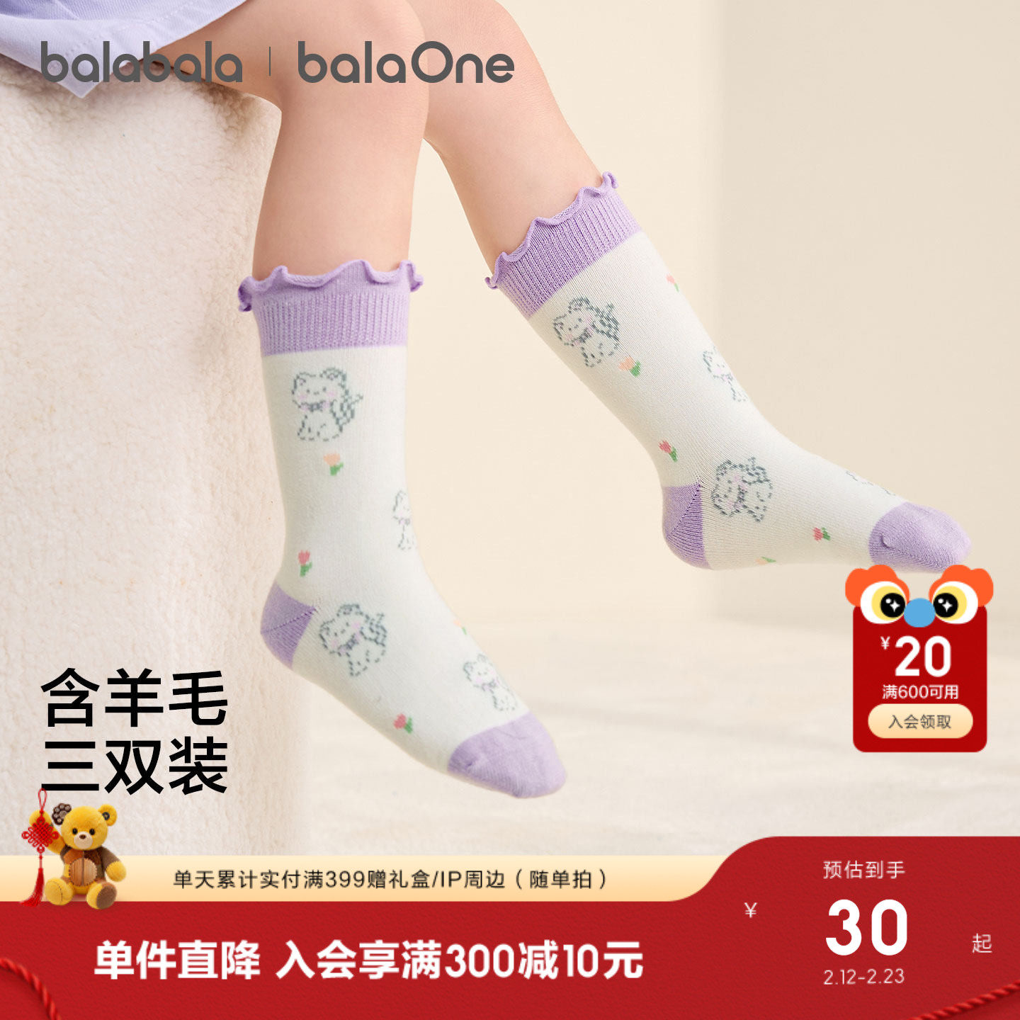 【balaOne】巴拉巴拉儿童袜子秋冬新女童袜子中大童含羊毛三双装