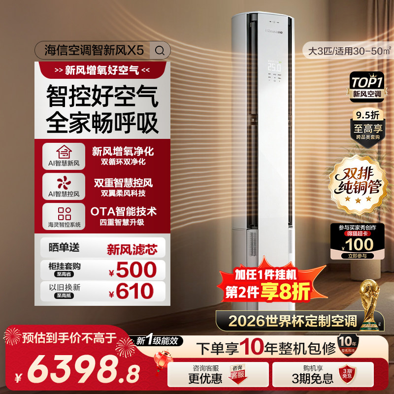 新品海信璀璨新风空调X5大3匹一级能效柜机以旧换新世界杯定制