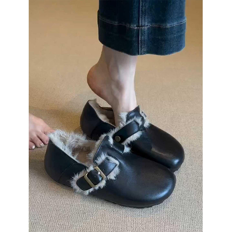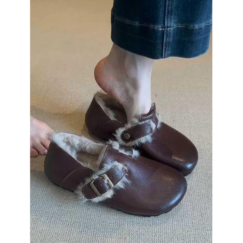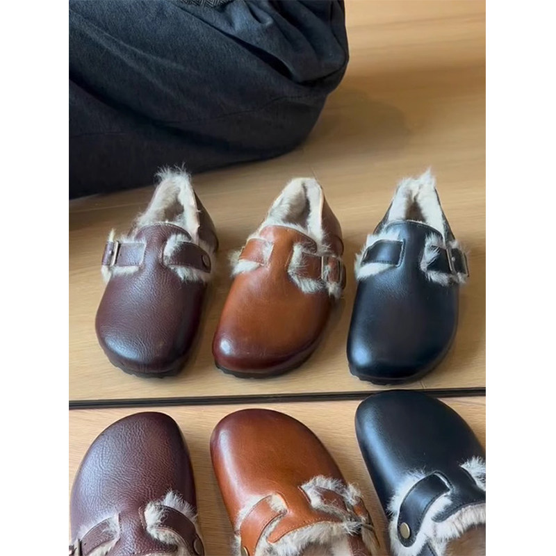 羊皮版~复古羊羔毛真皮擦色勃肯鞋女防滑外穿加绒毛毛鞋单鞋圆头