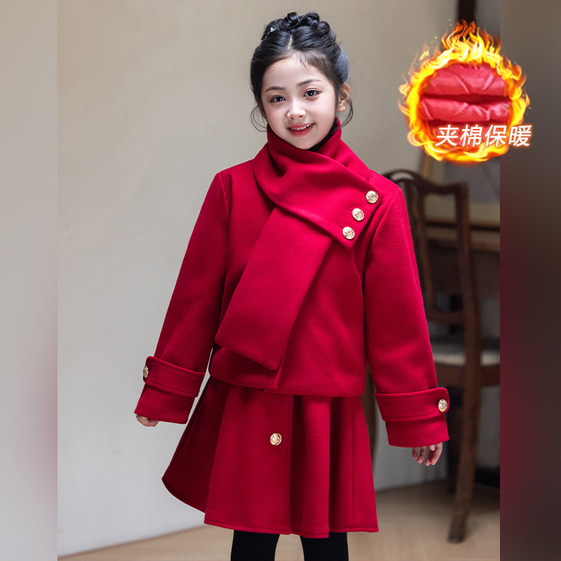 女童毛呢套装公主裙儿童新年红色连衣裙小女孩富家千金感加厚裙子