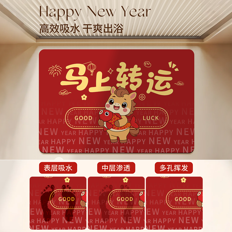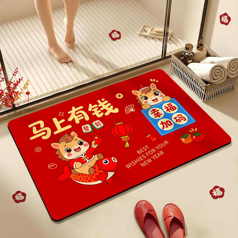 新年浴室地垫卫生间吸水防滑硅藻泥淋浴房脚垫红色喜庆耐脏防摔垫