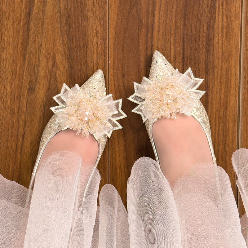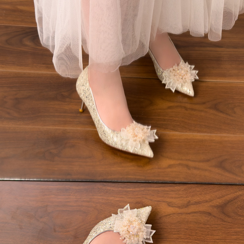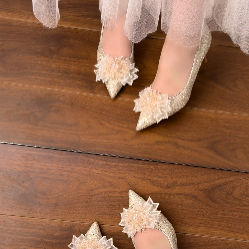 婚鞋女2024年新款主婚纱新娘鞋亮片香槟色水晶鞋尖头细跟高跟鞋女