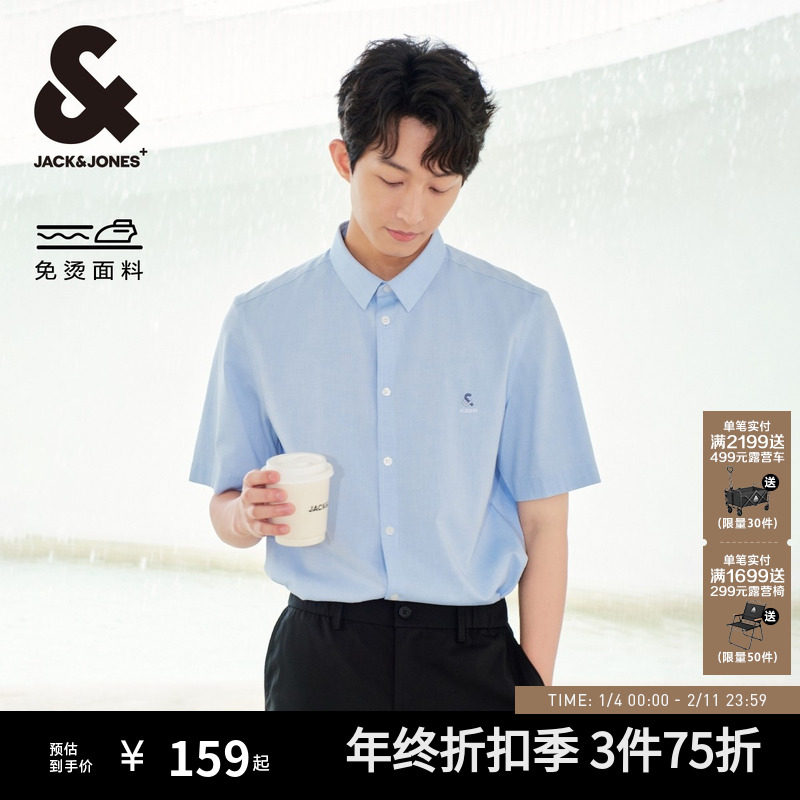 【免烫零压】杰克琼斯男装秋季新款易打理短袖衬衫刺绣白衬衣休闲