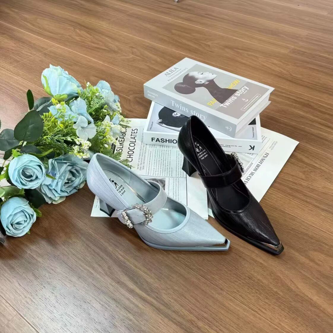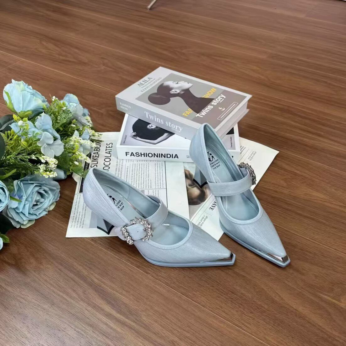 玛丽珍鞋女2026新款春季时尚气质百搭粗跟尖头高跟鞋子蓝色真皮