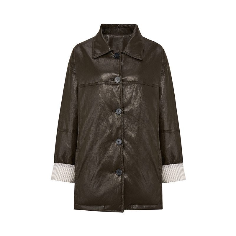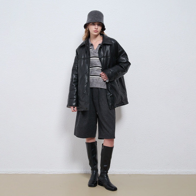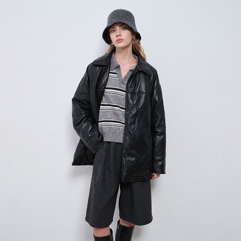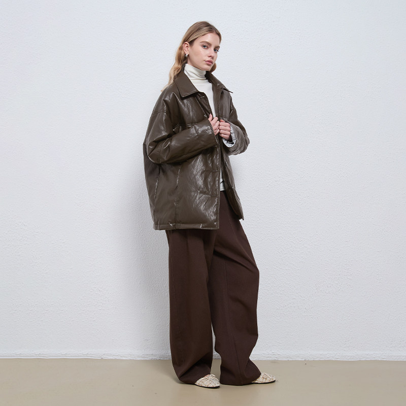 Petit Bari摩登复古翻领中长款羽绒皮衣外套女 秋冬 廓形翻领外套