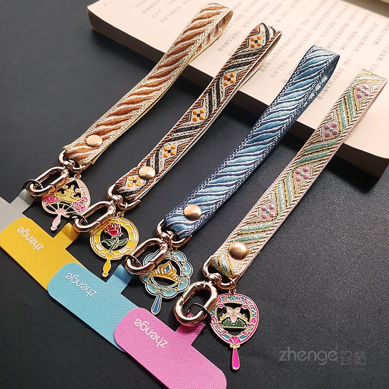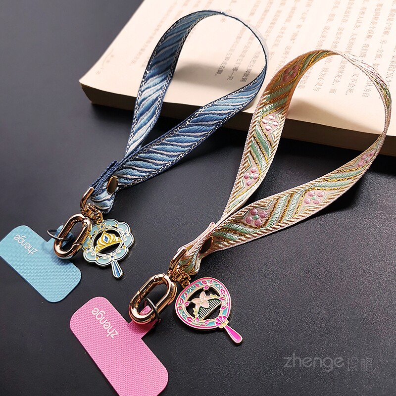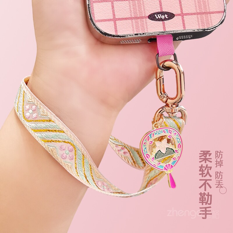 手机挂绳手腕短款国风花纹刺绣织带团扇吊坠户外防丢链钥匙壳结实