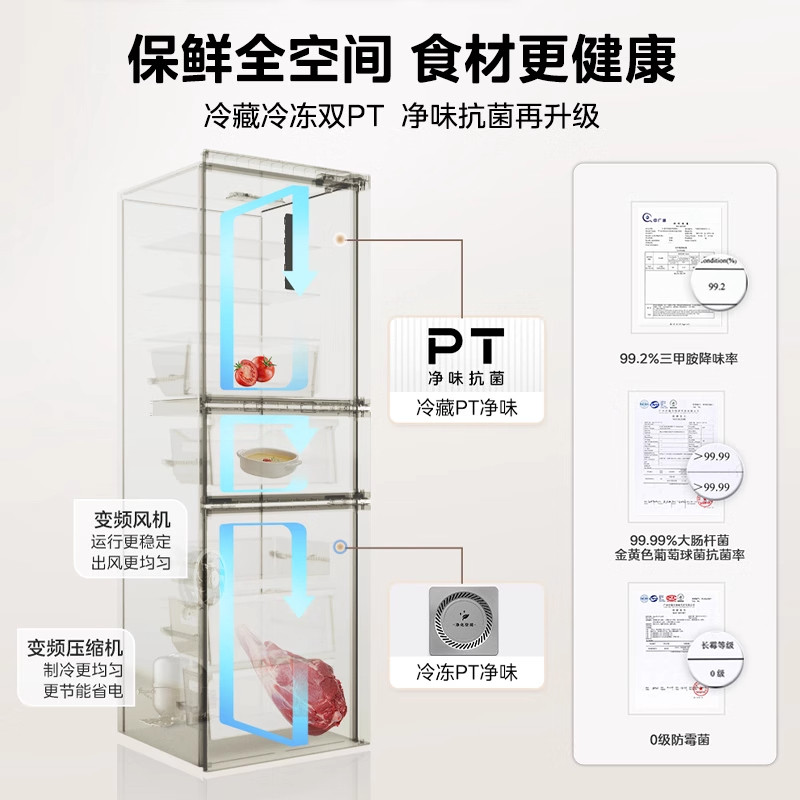 美的283白色三开门风冷无霜家用小型租房宿舍变频一级能效电冰箱