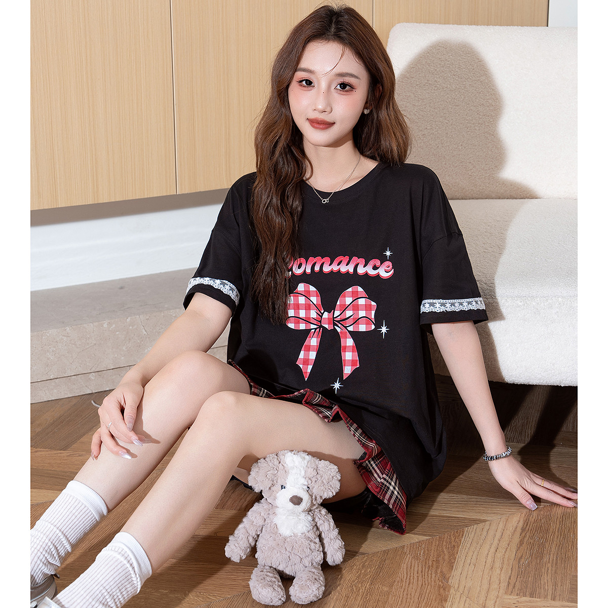 唐狮春夏季新款短袖T恤女黑色蝴蝶结印花宽松休闲风设计感上衣