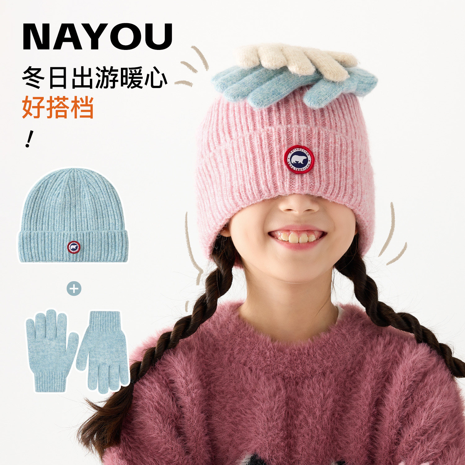 纳柚儿童帽子秋冬男女童针织毛线帽中大童分指手套保暖两件套