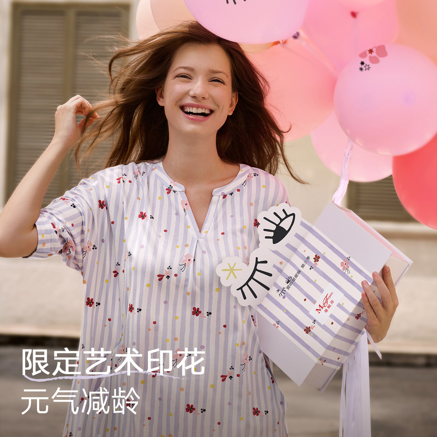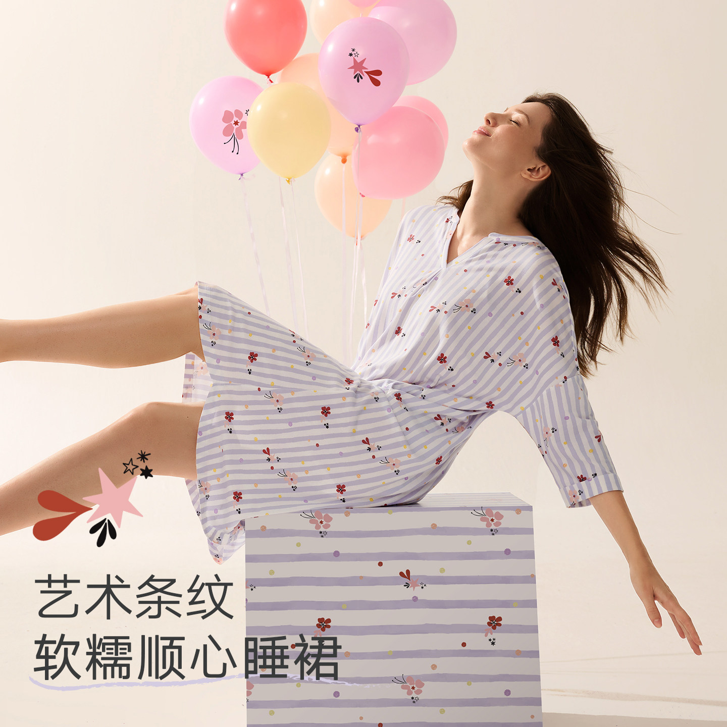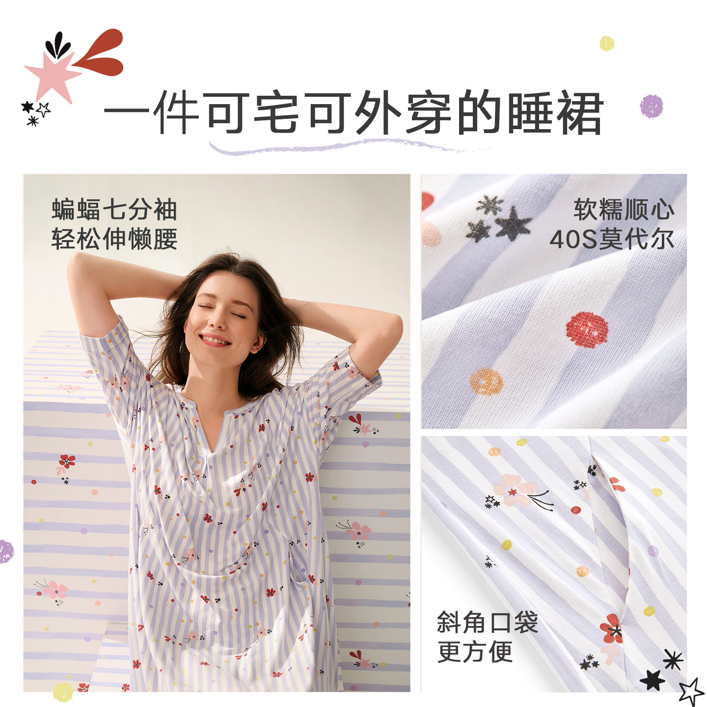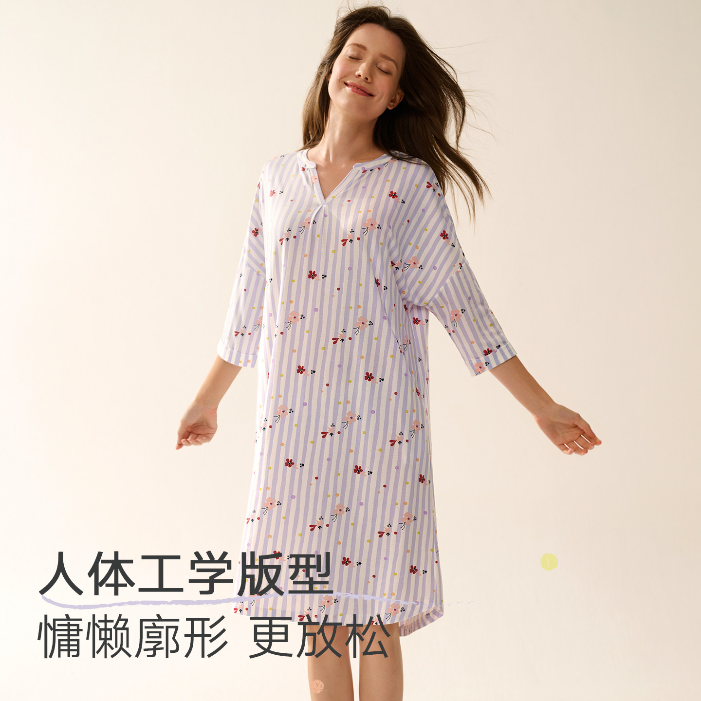 曼妮芬秋冬印花女士莫代尔家居服V领显瘦连衣裙可外穿睡裙女睡衣