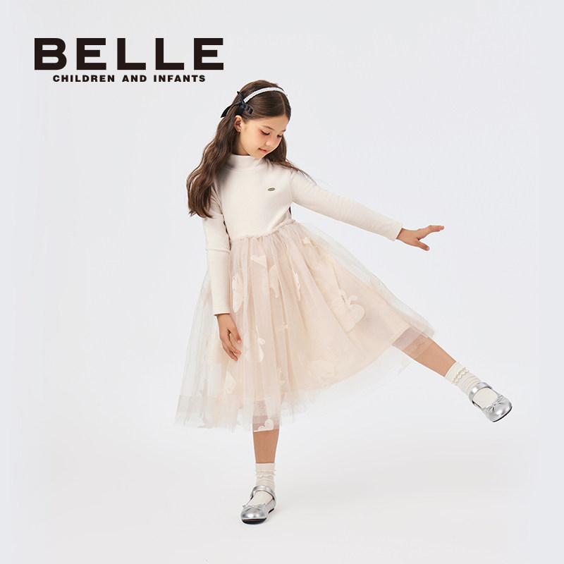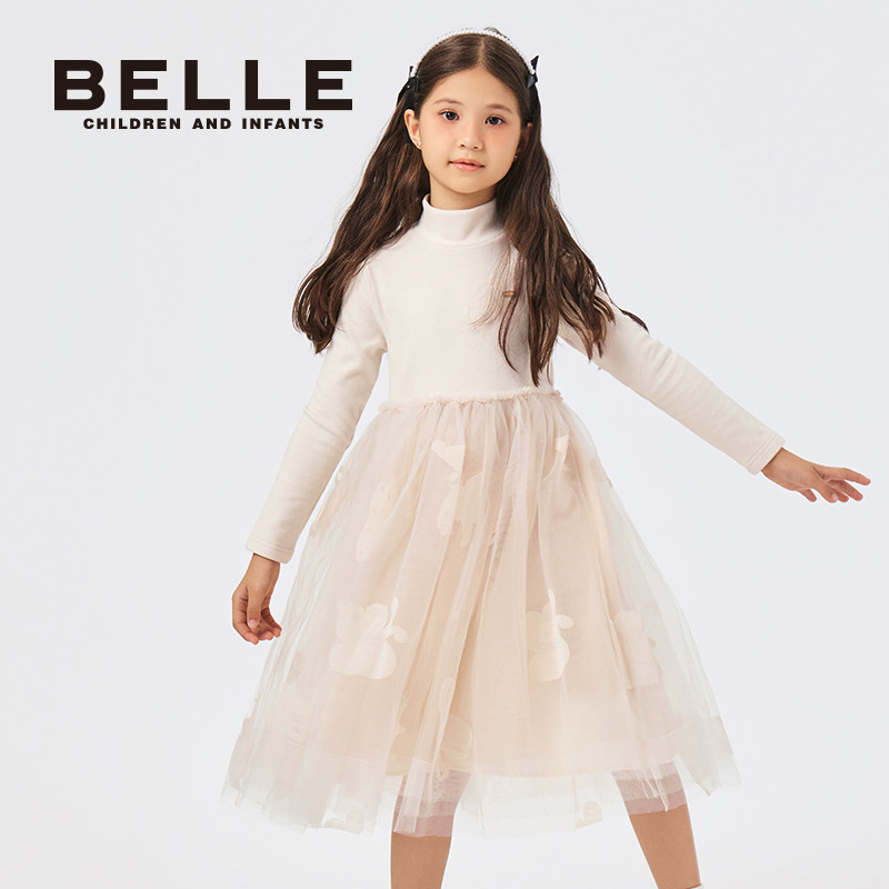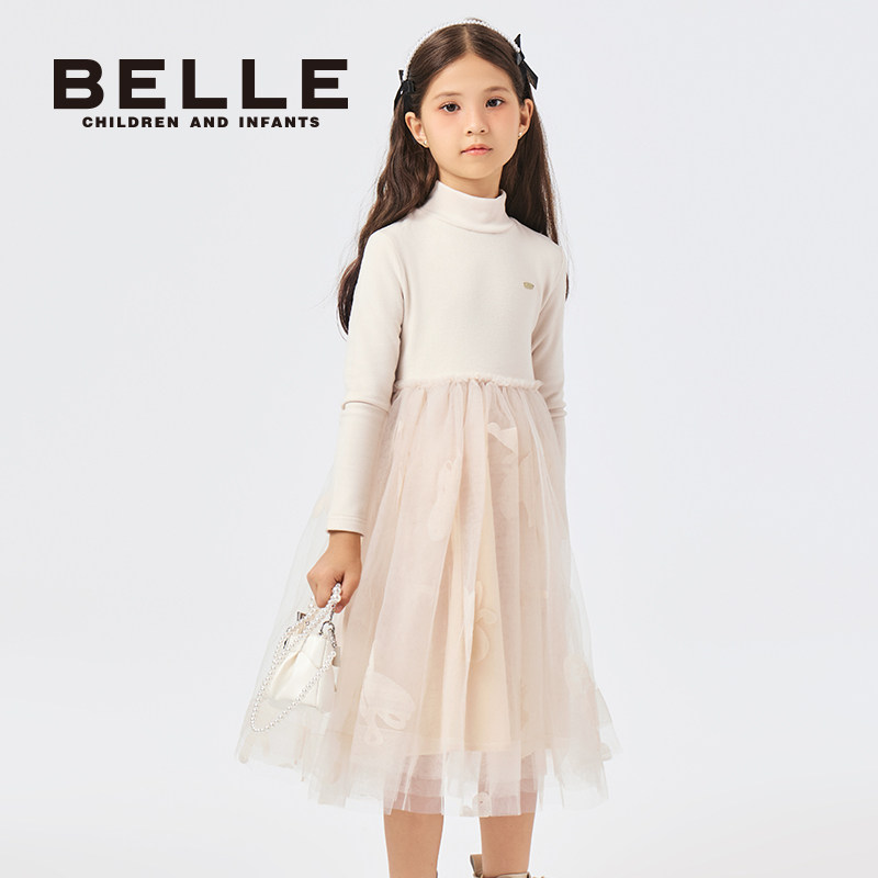 百丽童装长袖网纱拼接裙2026年秋冬新款儿童半高领裙子女童连衣裙