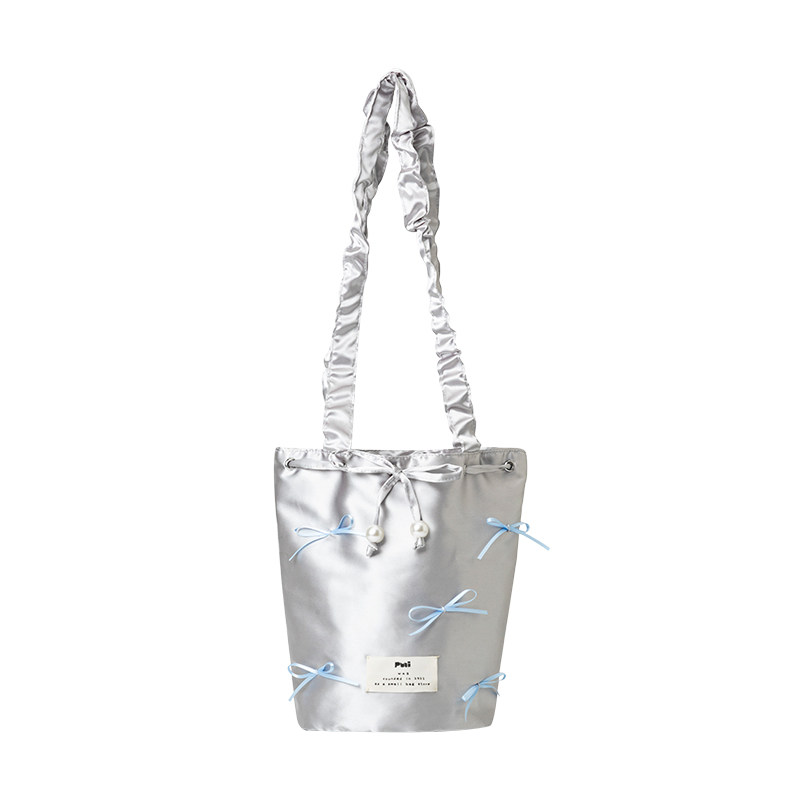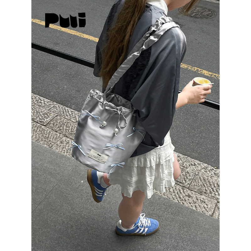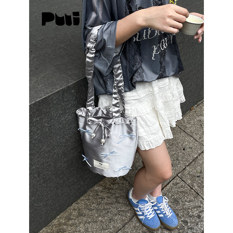 puui原创生活单肩包银色手提包可爱蝴蝶结手拎包通勤水桶包ins女