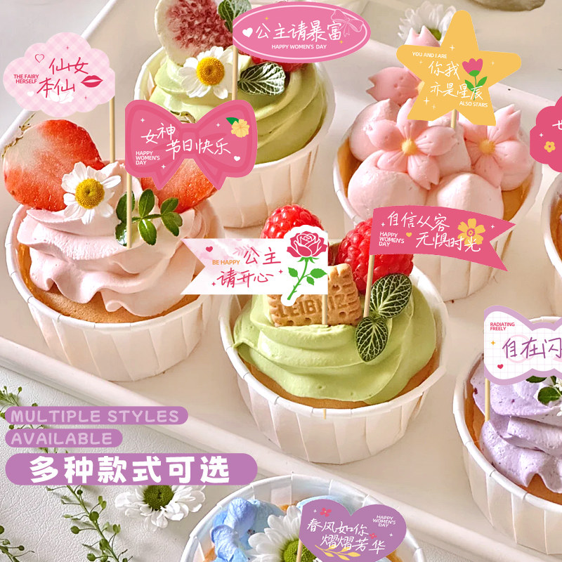 女神节网红甜品蛋糕牙签小插旗子三八妇女节装饰贴纸火锅菜品冰粉汉堡烘焙插牌水果叉创意食品标签插件旗帜