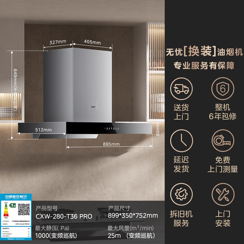 美的家用厨房大吸力抽油烟机T36pro欧式挥手智控免拆洗官方店正品