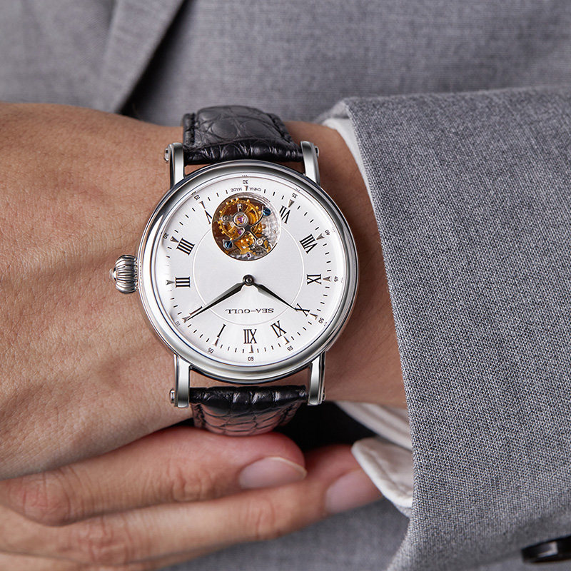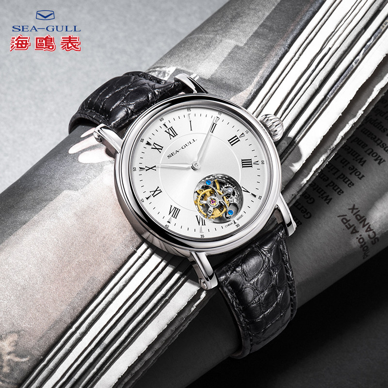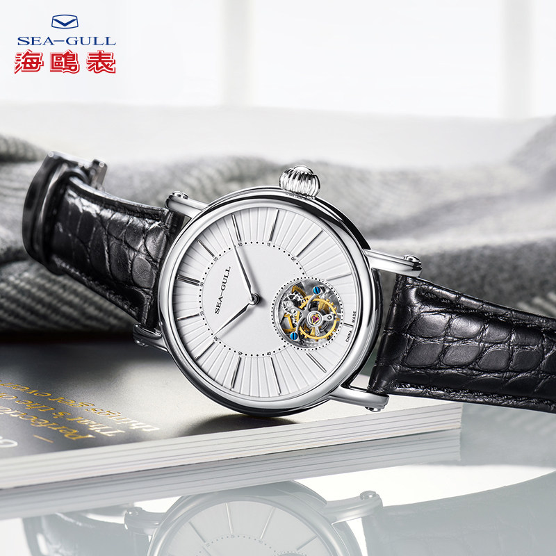 海鸥表手表男精钢鳄鱼皮陀飞轮男表机械腕表传承系列6018