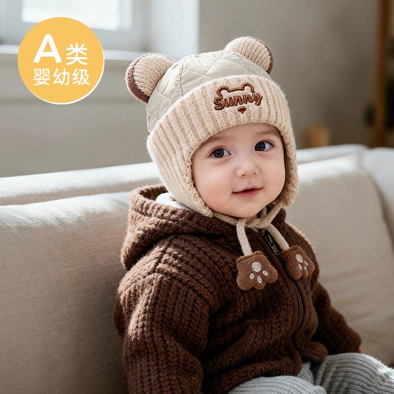 十月结晶粒粒阳光婴儿帽子一体加厚帽子秋冬季保暖护耳帽宝宝冬帽