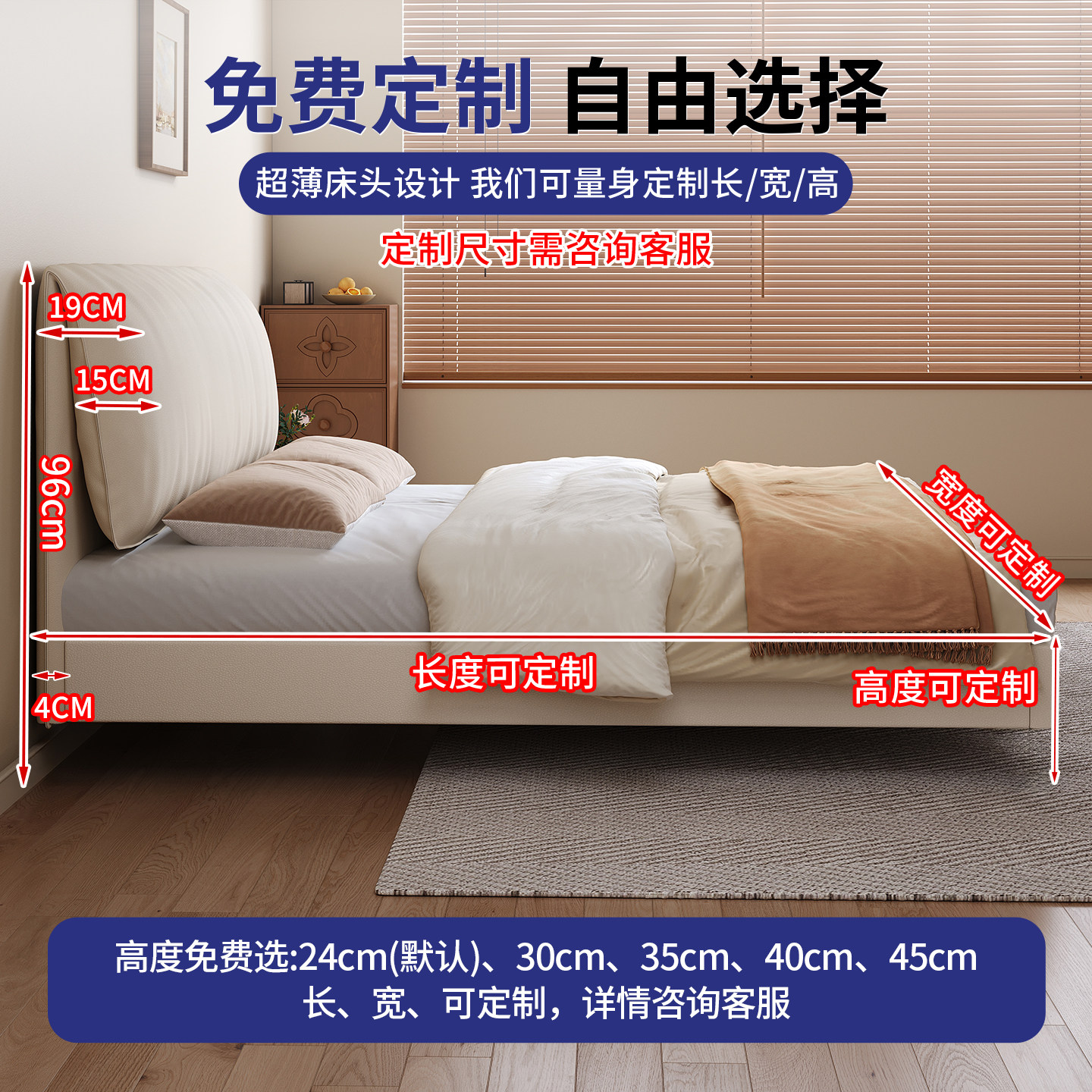 小户型全实木薄床头软靠床主卧1.5m双人大床榉木静音悬浮床可定制