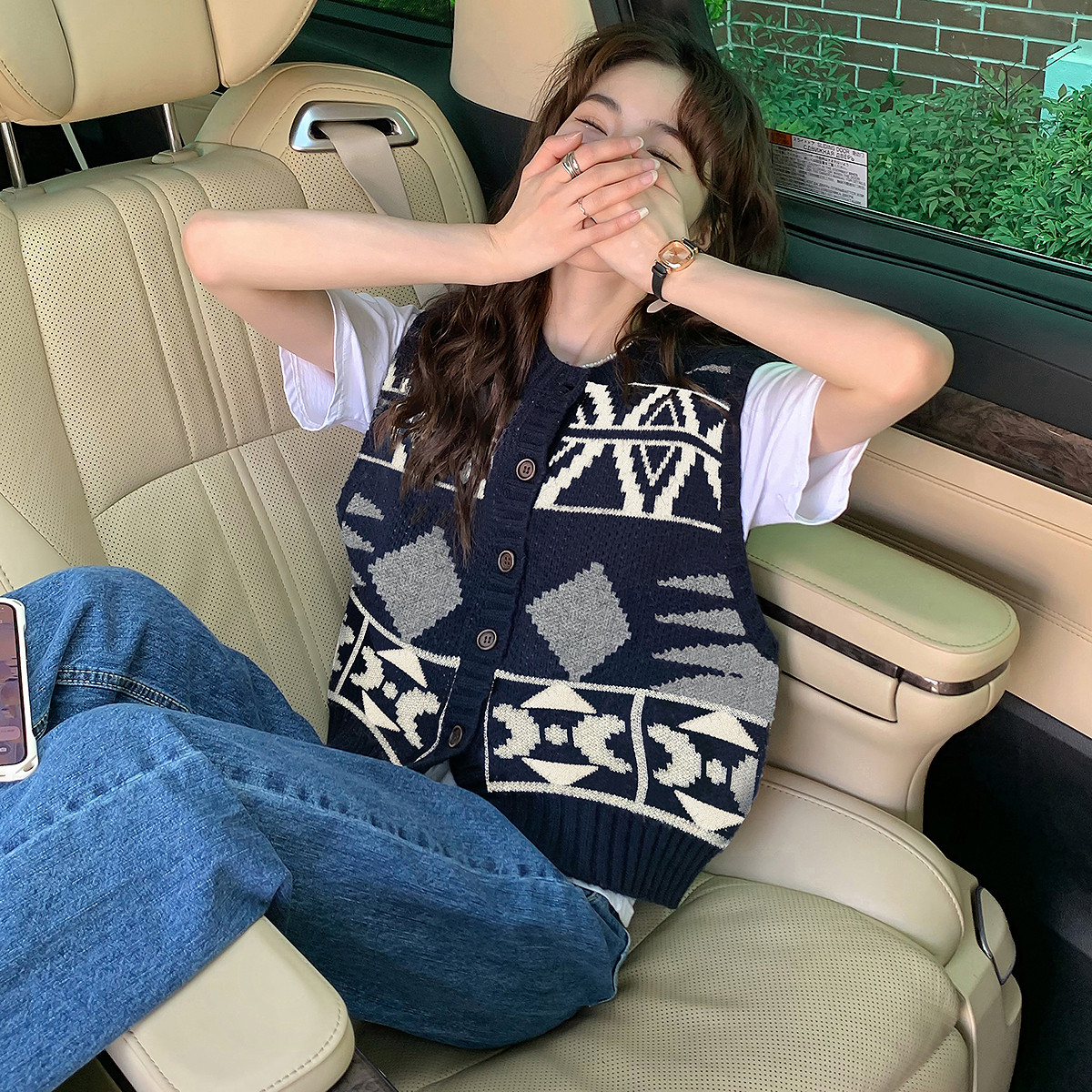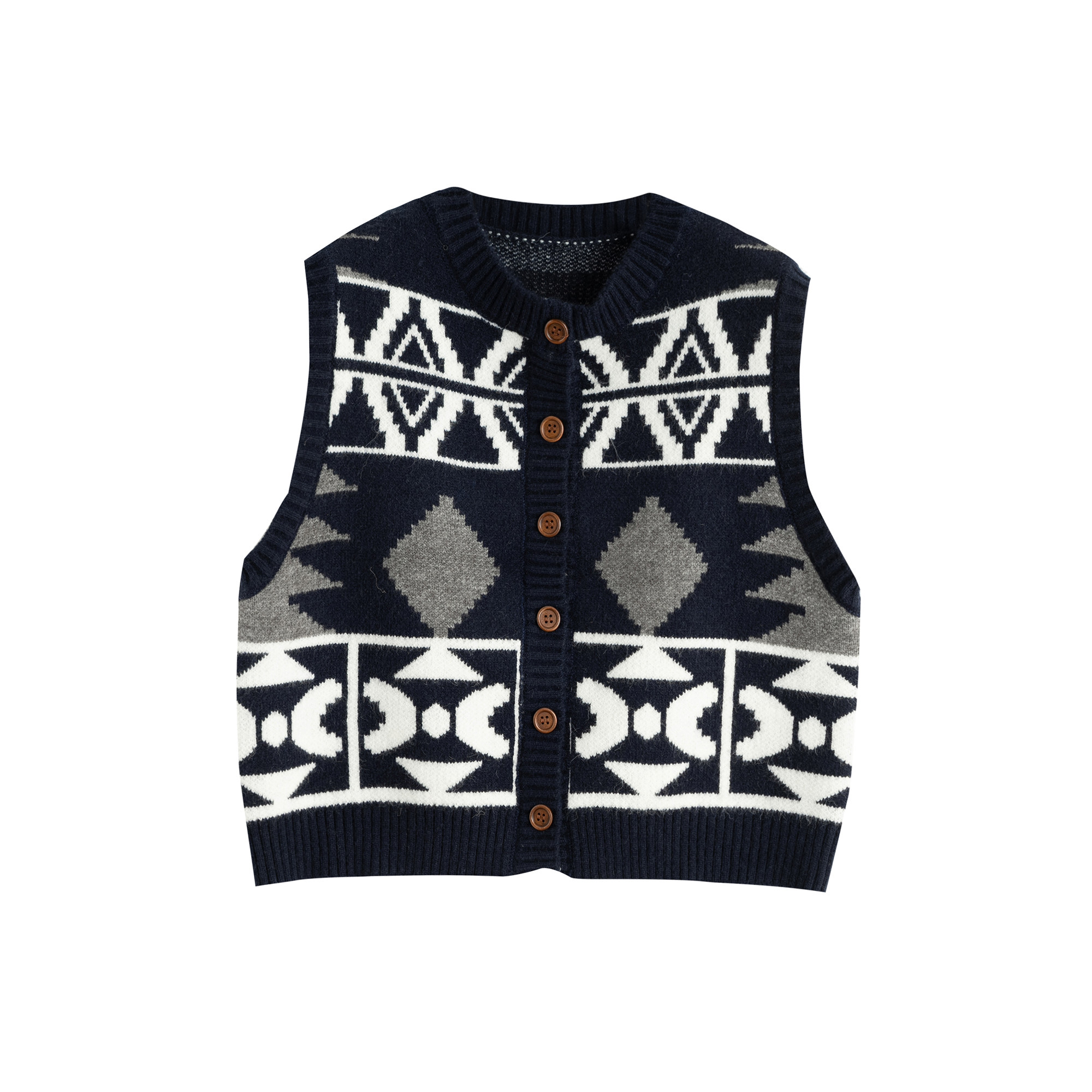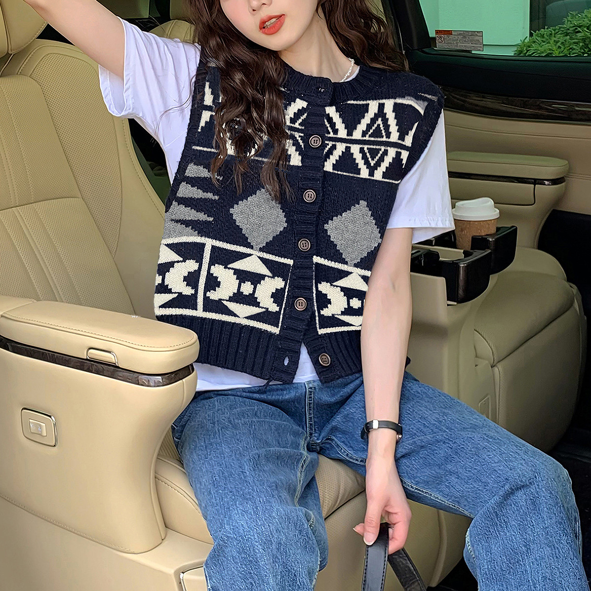 唐狮复古图案圆领开衫马甲春秋冬季红色费尔岛针织衫外套TD