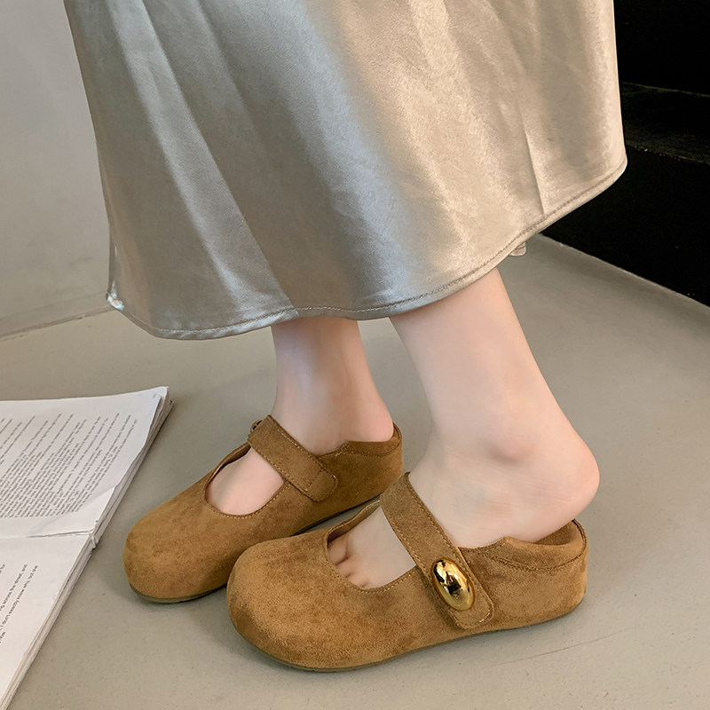 磨砂牛皮松糕厚底大头勃肯鞋女复古真皮圆头增高一脚蹬懒人毛毛鞋