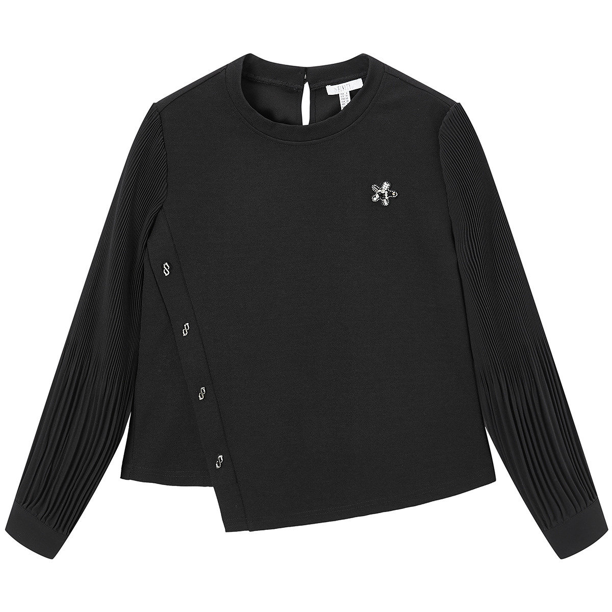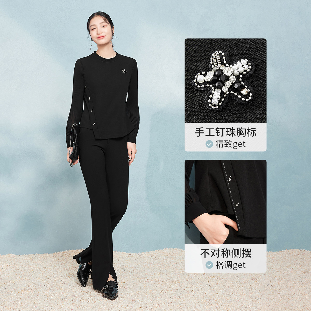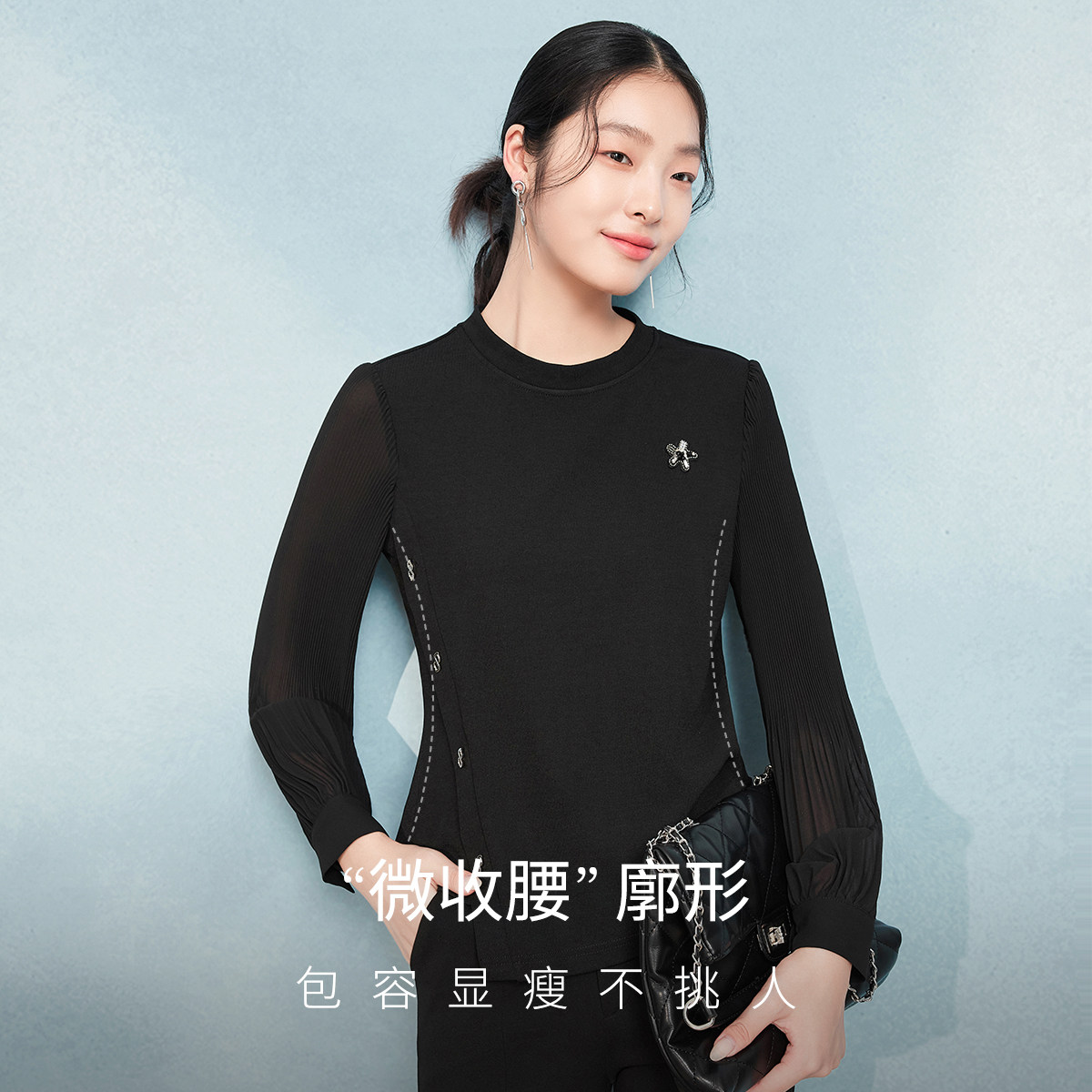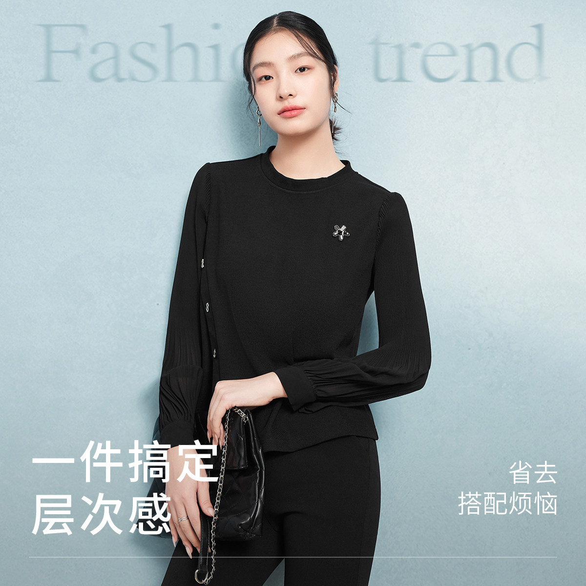 菲妮迪假两件雪纺衫2025年秋季新款手工钉珠设计感上衣女