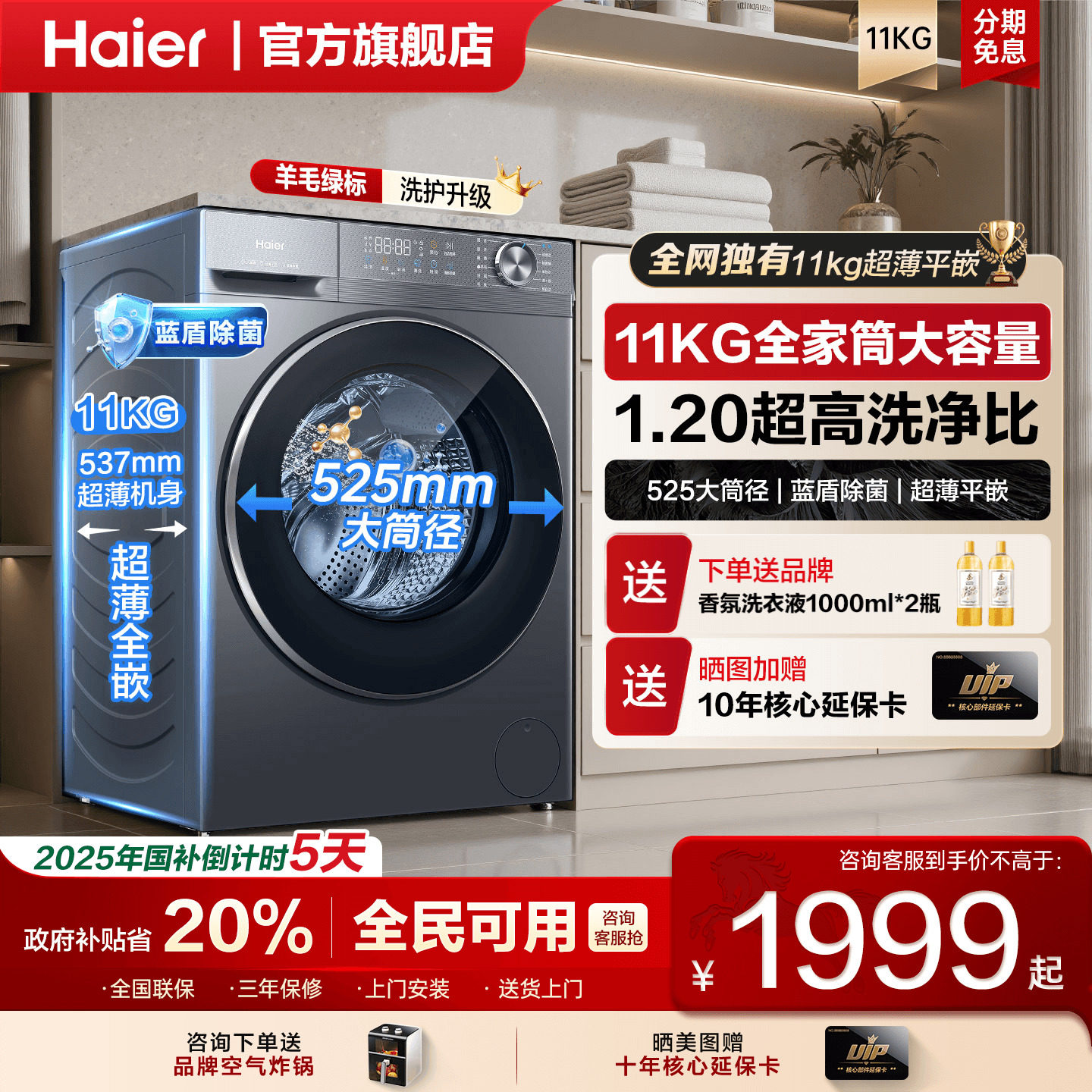 海尔11公斤大容量洗衣机 咨询客服立省