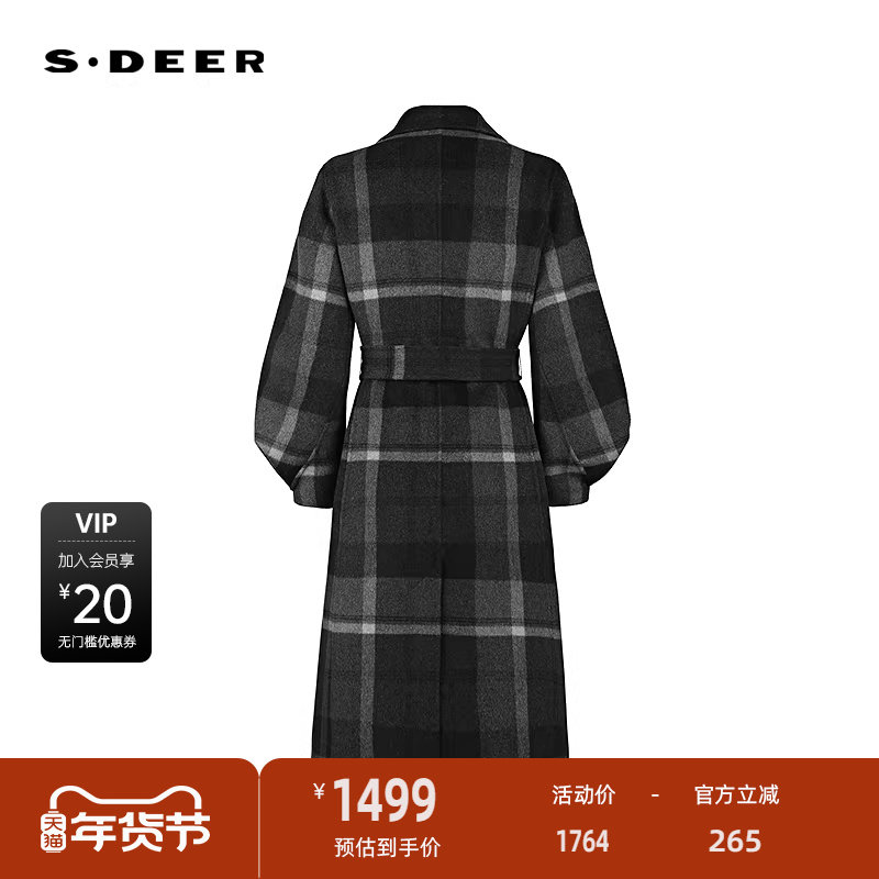 sdeer圣迪奥女装25年新品西装领收腰格纹长款毛呢大衣S25482519