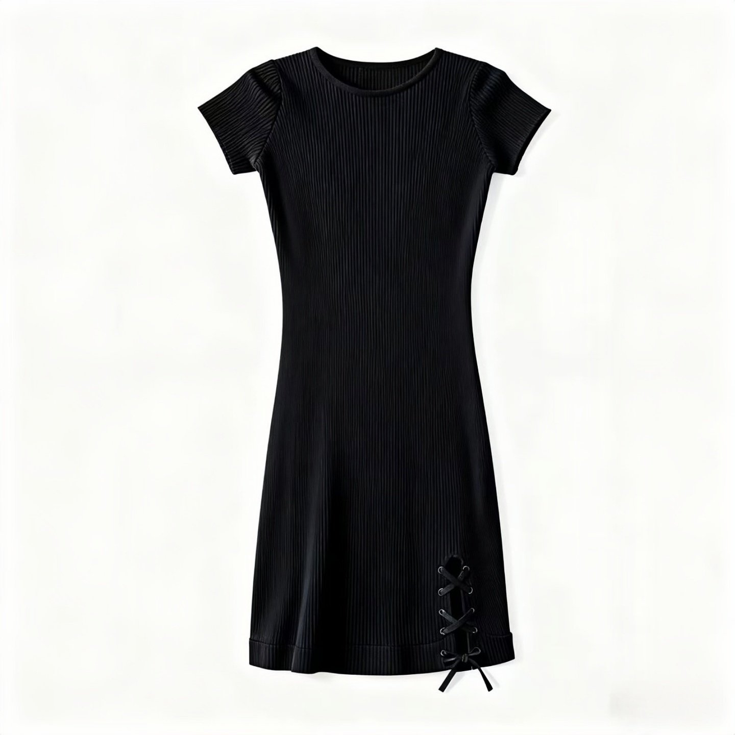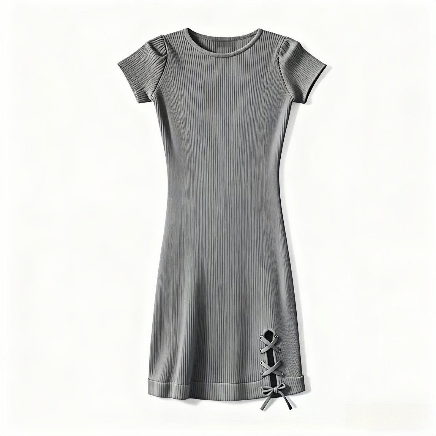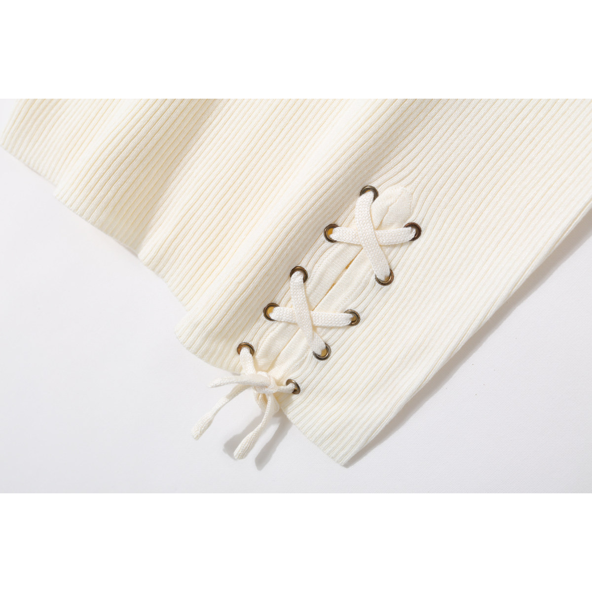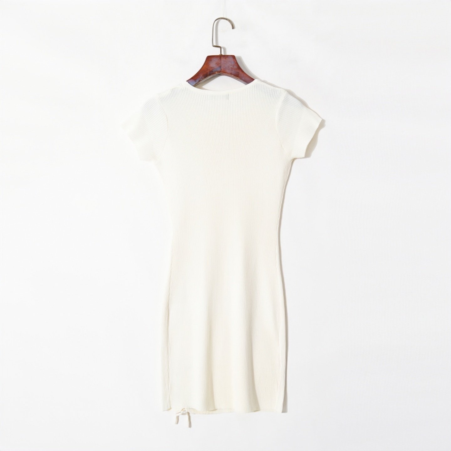 春夏米白色坑条修身针织连衣裙女 系带辣妹风显瘦百搭短袖包臀裙