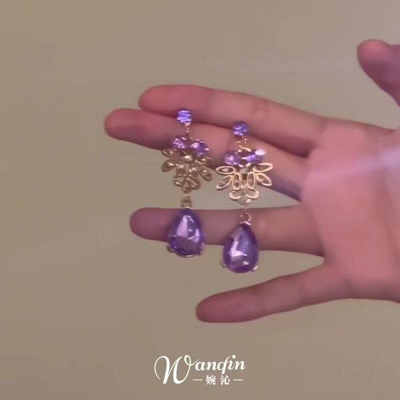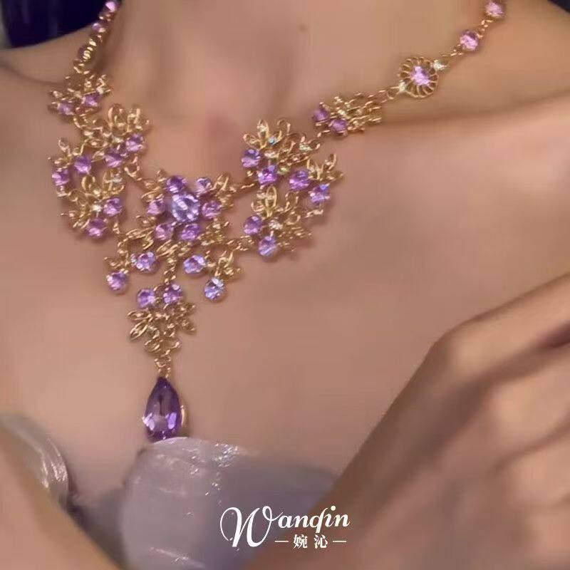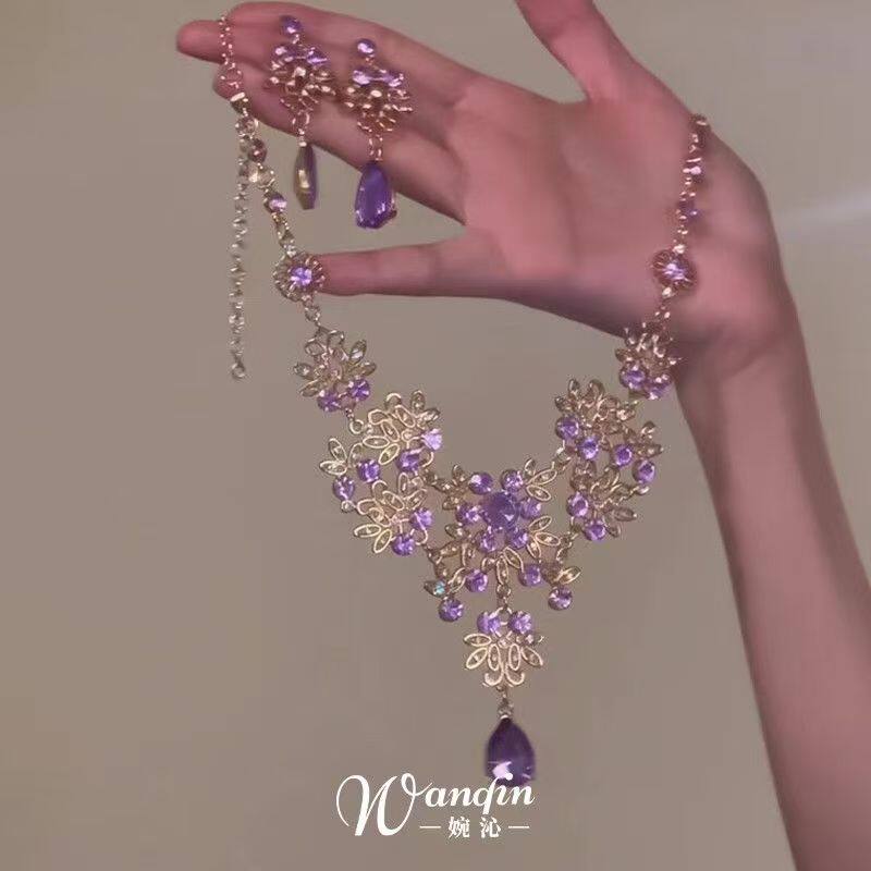 「紫罗兰」法式紫色蕾丝水滴项链复古千金感气质锁骨链配裙子耳钉