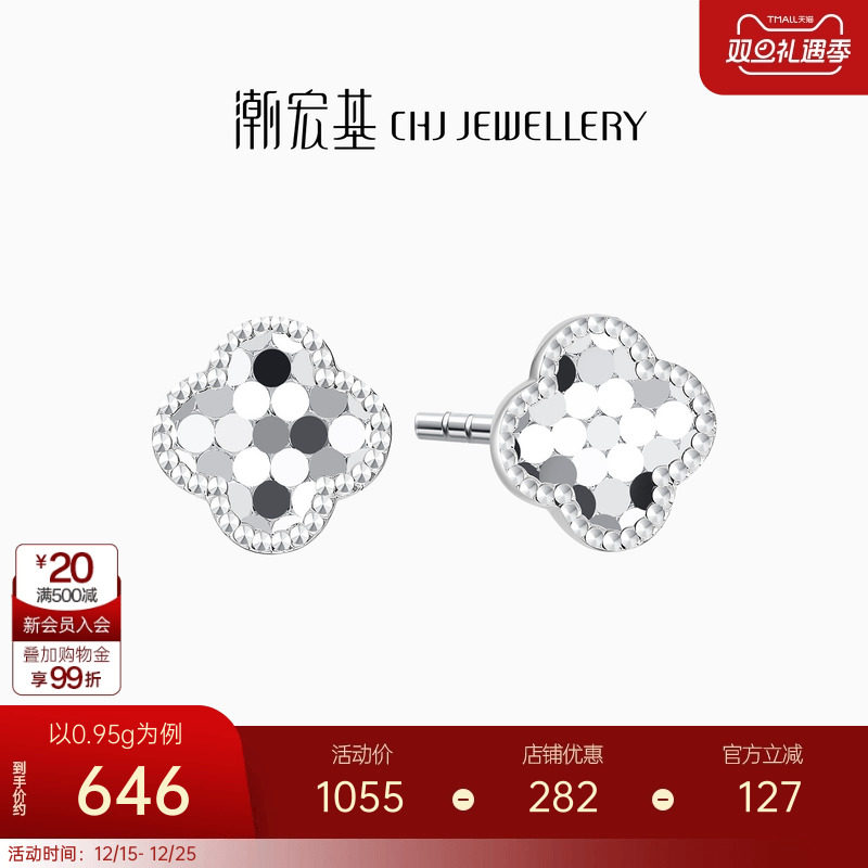 潮宏基铂雅铂金耳钉白金PT950四叶草镜面CNC龙鳞礼物女通勤百搭