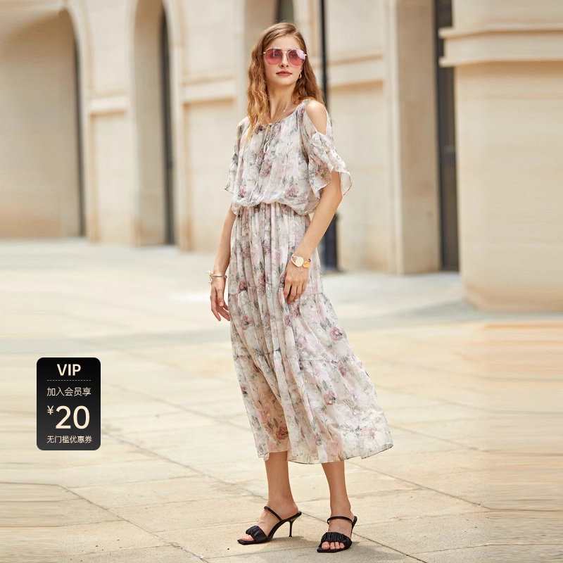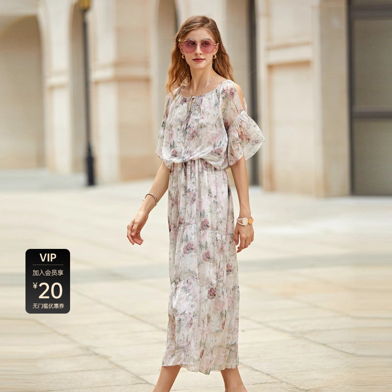 系带连衣裙 清新印花 露肩设计