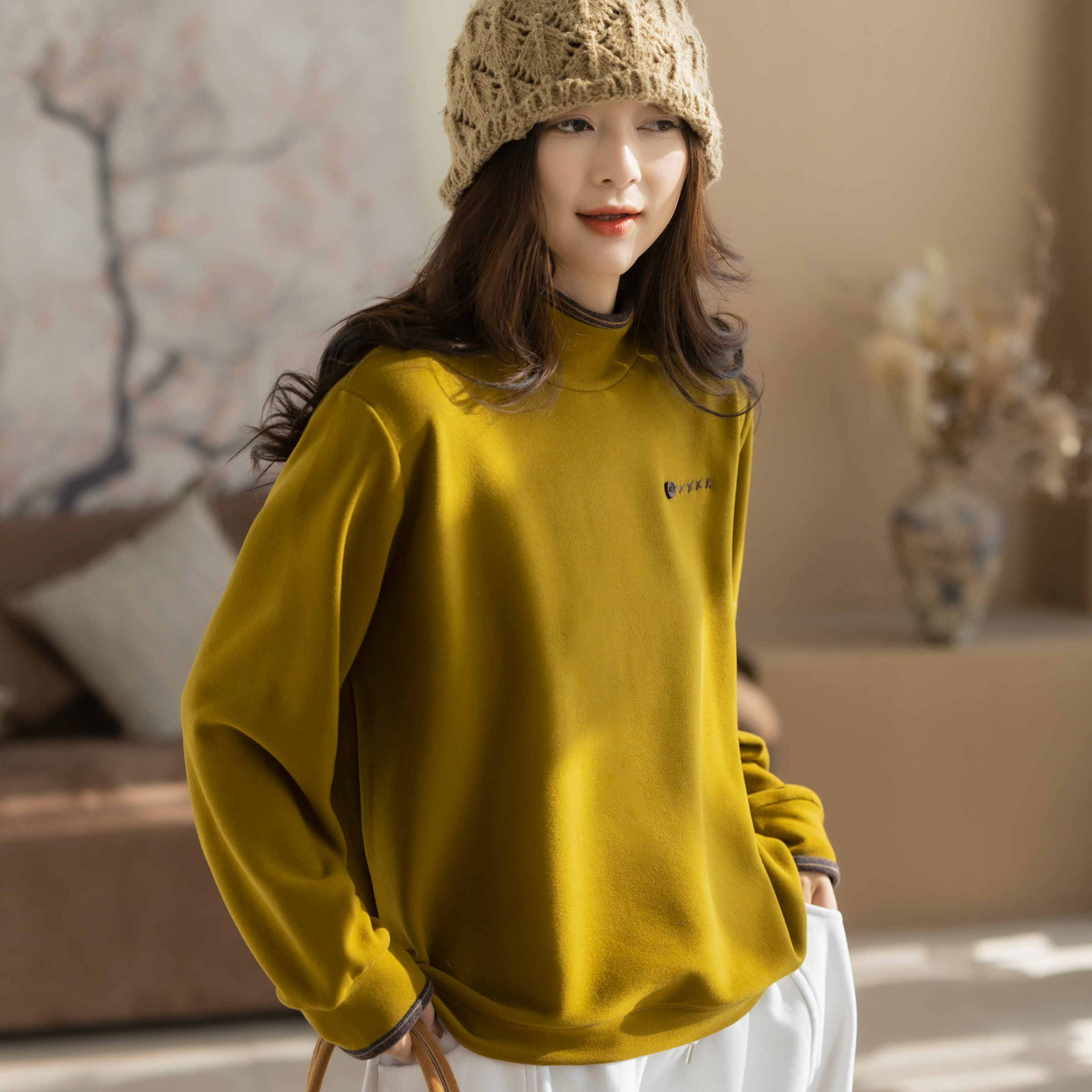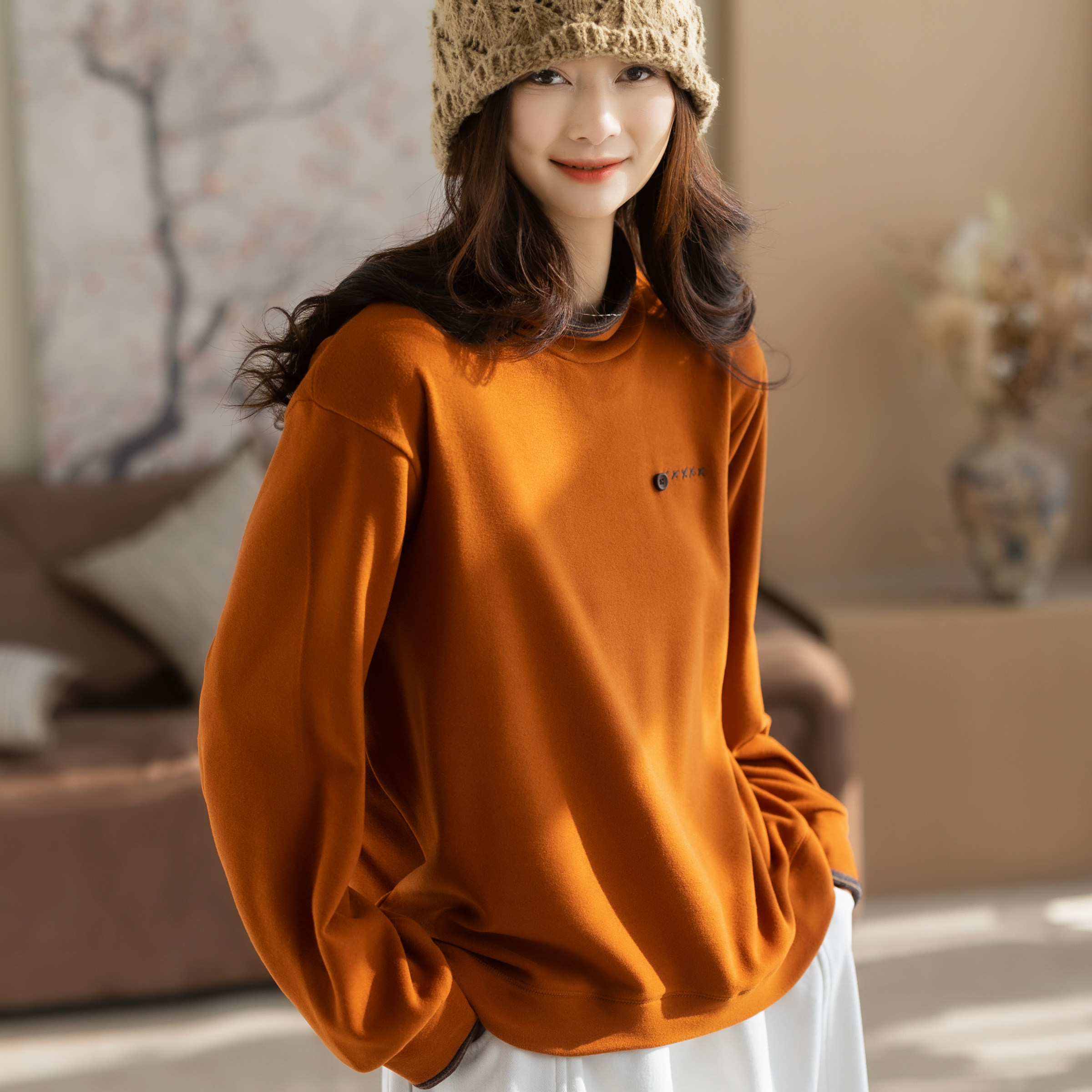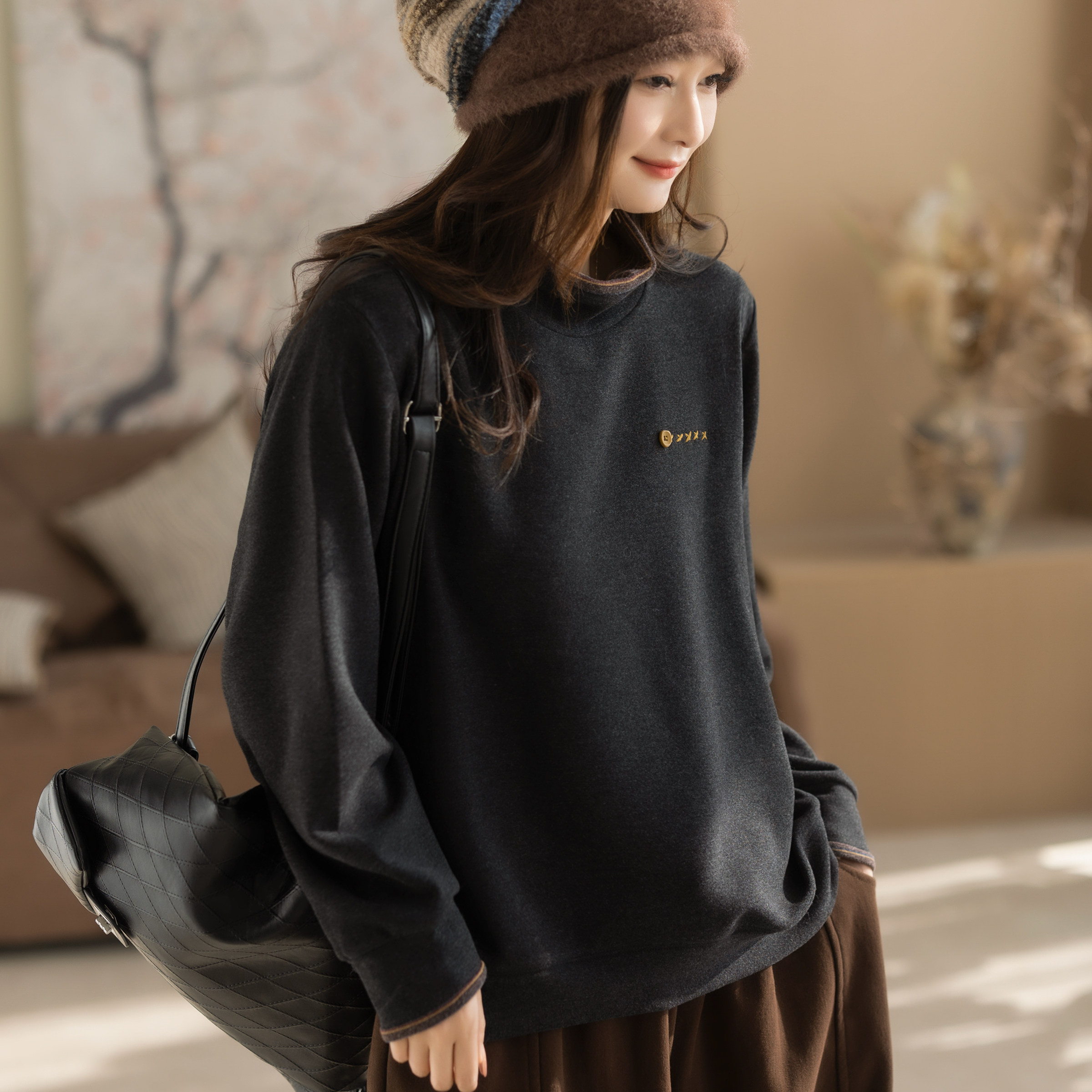 咖咪羽打底衫女秋冬新款女士圆领复古黑色休闲流行洋气女装上衣