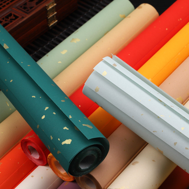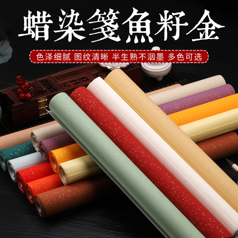 蜡染宣纸书法创作专用四尺对开六尺整张小楷毛笔书法作品纸洒金鱼籽金鎏金笺半生半熟半生熟红色仿古绿色白色