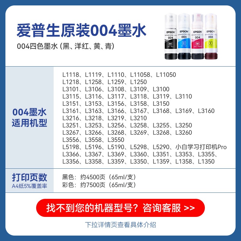 EPSON爱普生004原装墨水L3151 L3153 L3156 L3251 L3253 L3255 L3256 L3258 L3355 L3353 1258喷墨打印机彩色