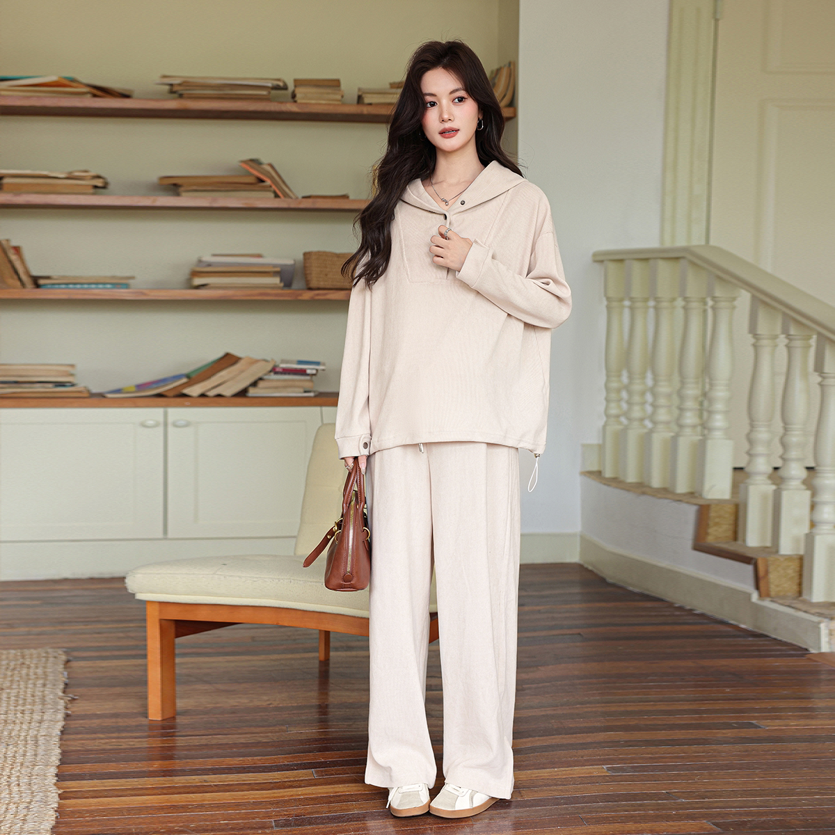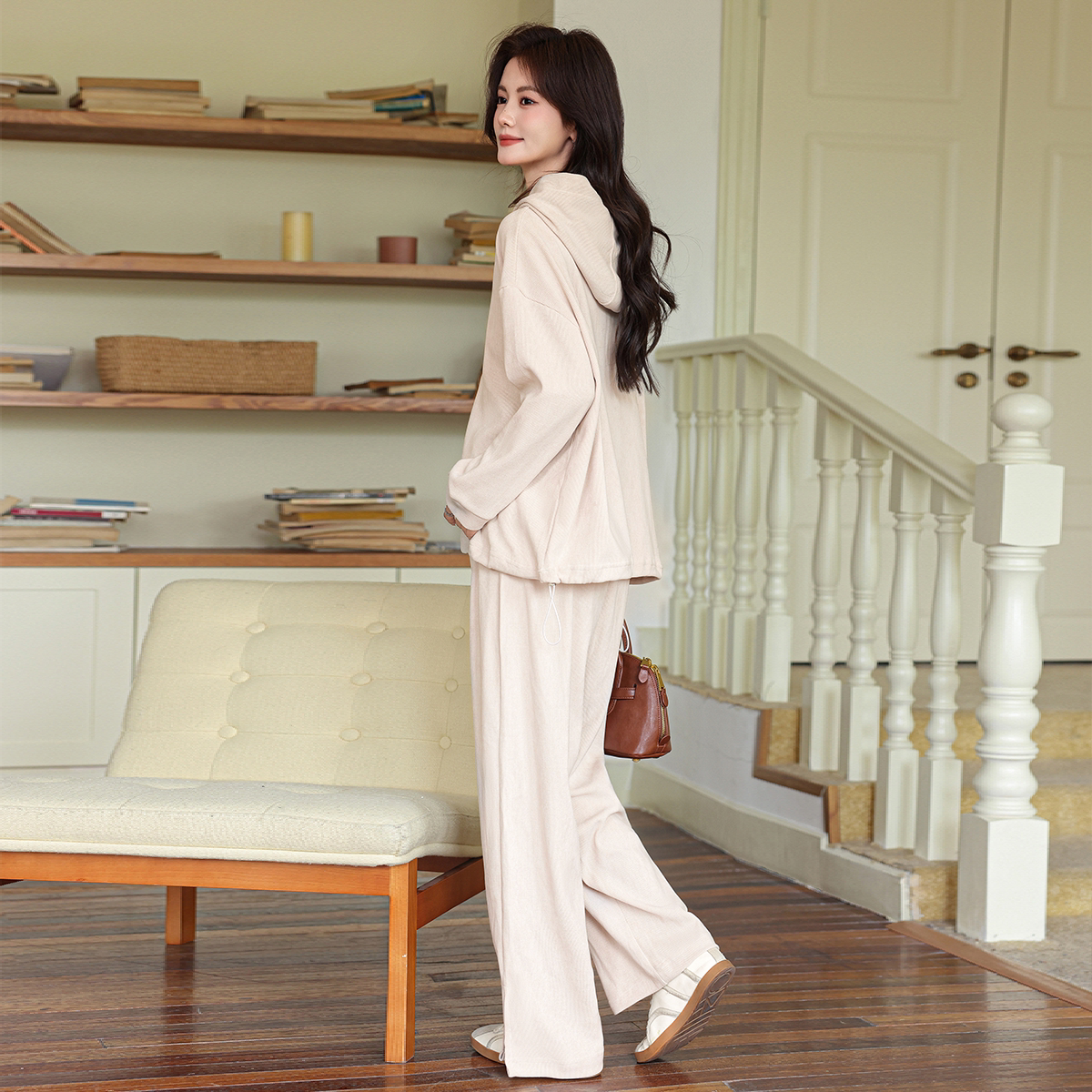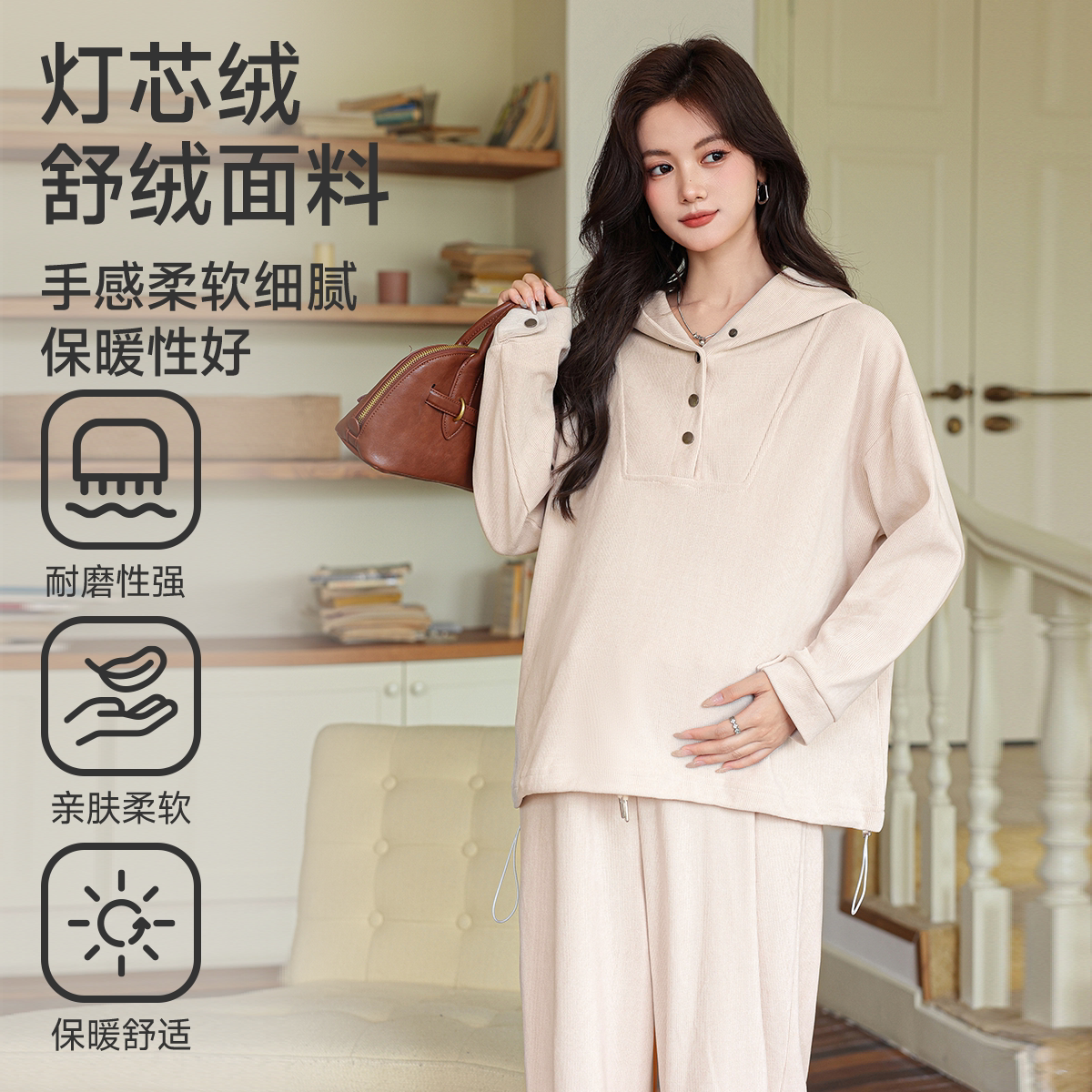 婧麒秋春孕妇套装新款灯芯绒抽绳连帽卫衣裤子孕期高级时尚穿搭女