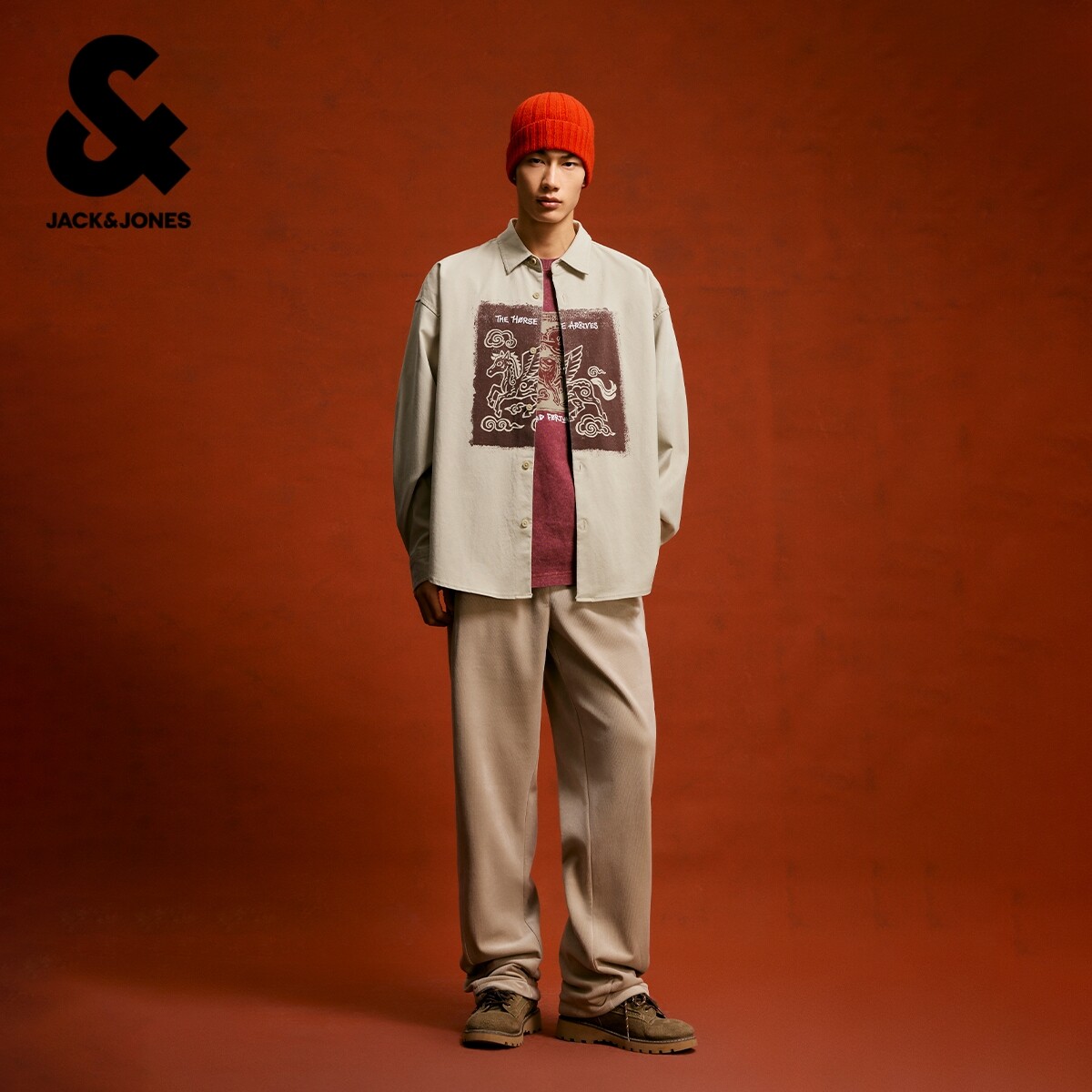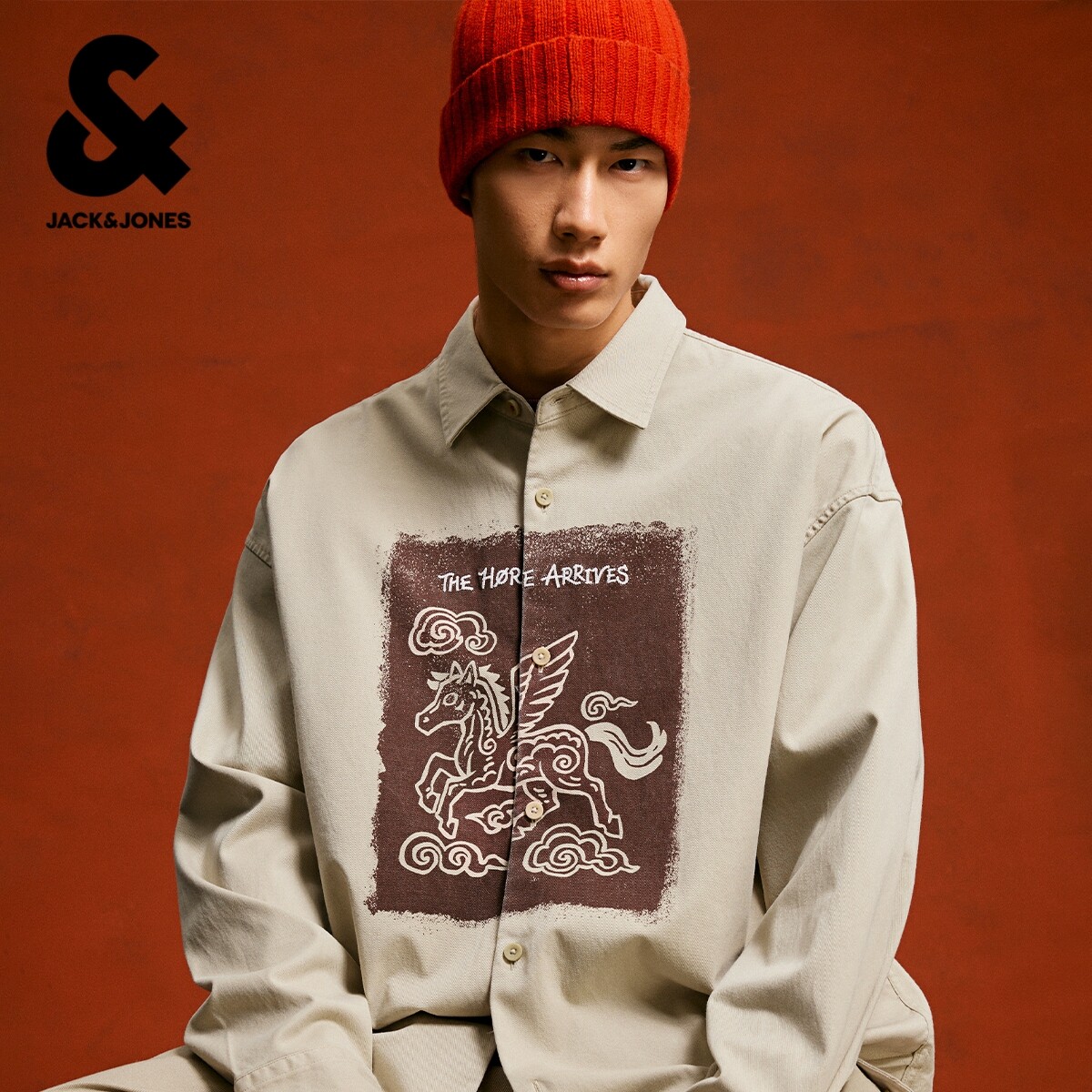 杰克琼斯男装春季马年生肖新年款马图案印花休闲宽松长袖衬衫外套