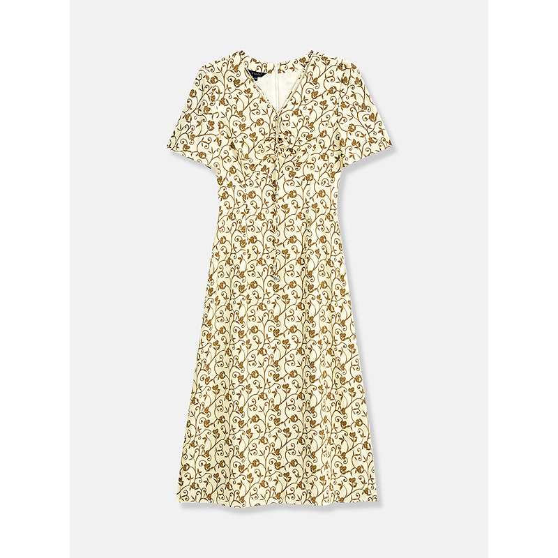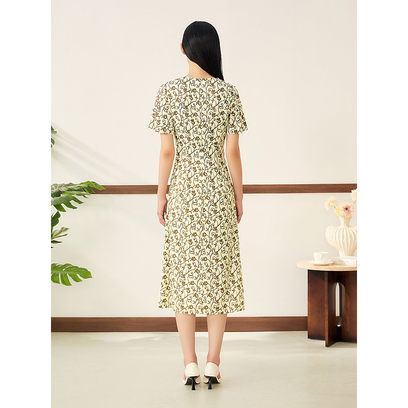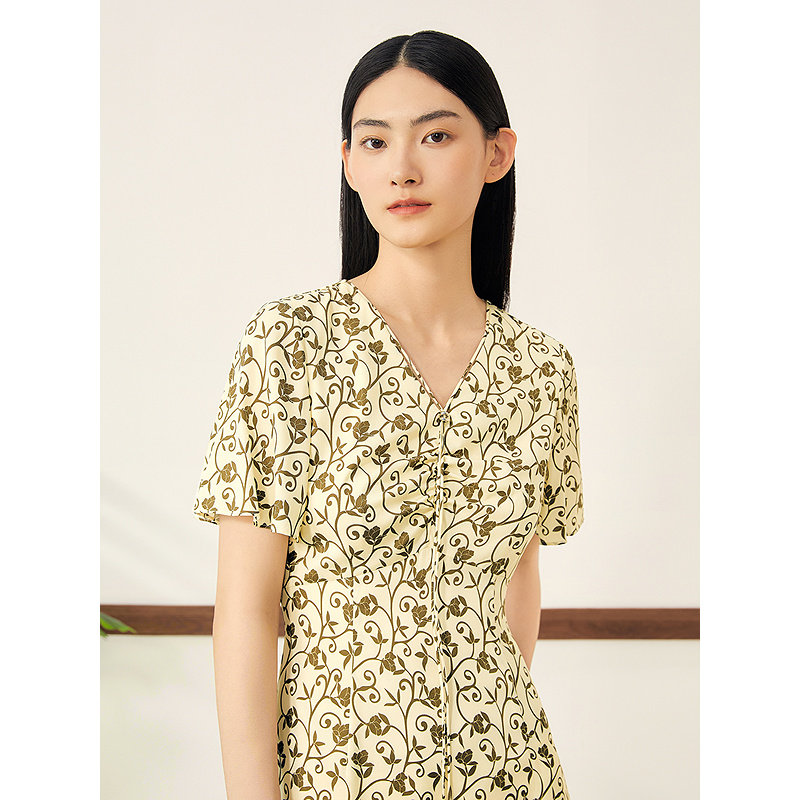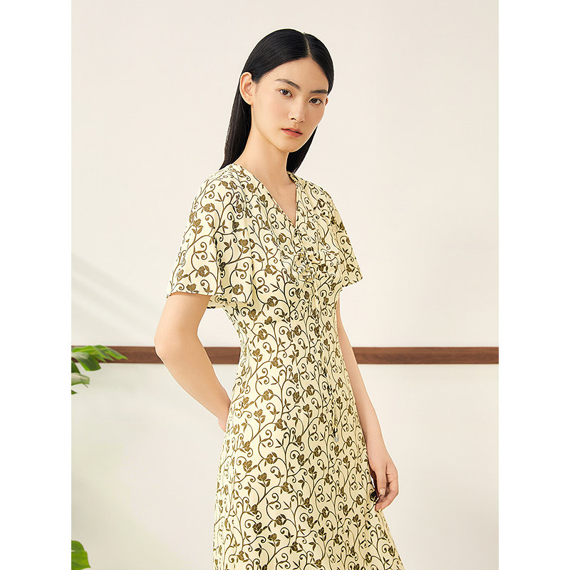 YINER音儿2025秋季新款法式复古花型印花V领蚕丝真丝茶歇连衣裙