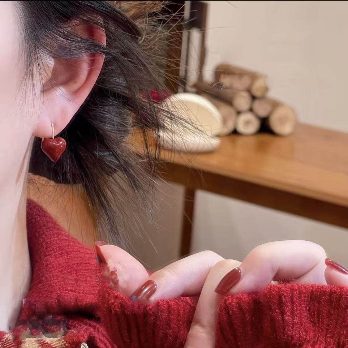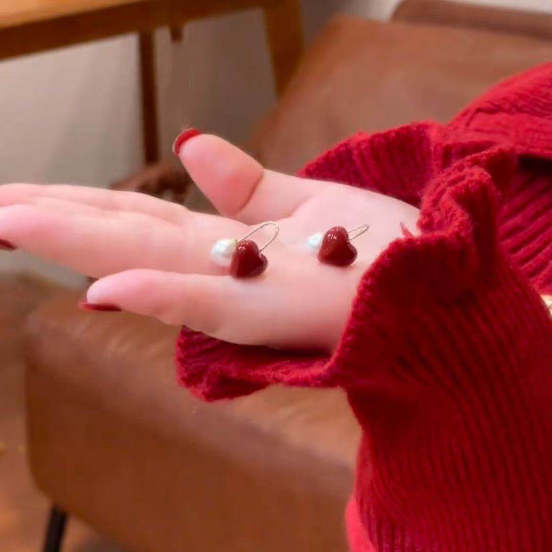 新年红色爱心珠珠耳环女2026新款爆款复古轻奢高级感气质简约耳饰