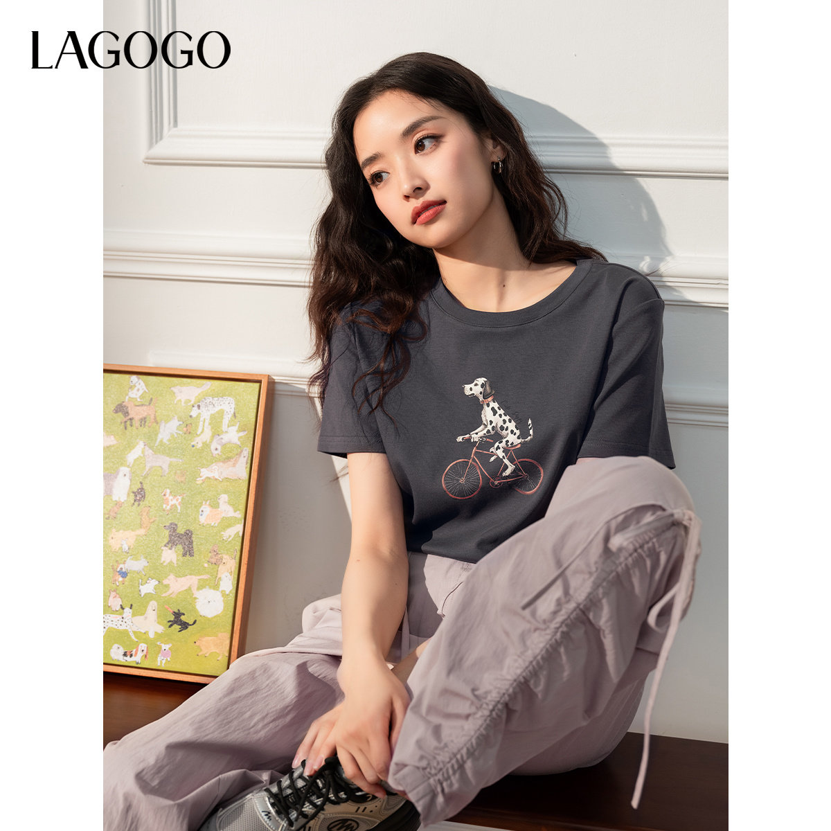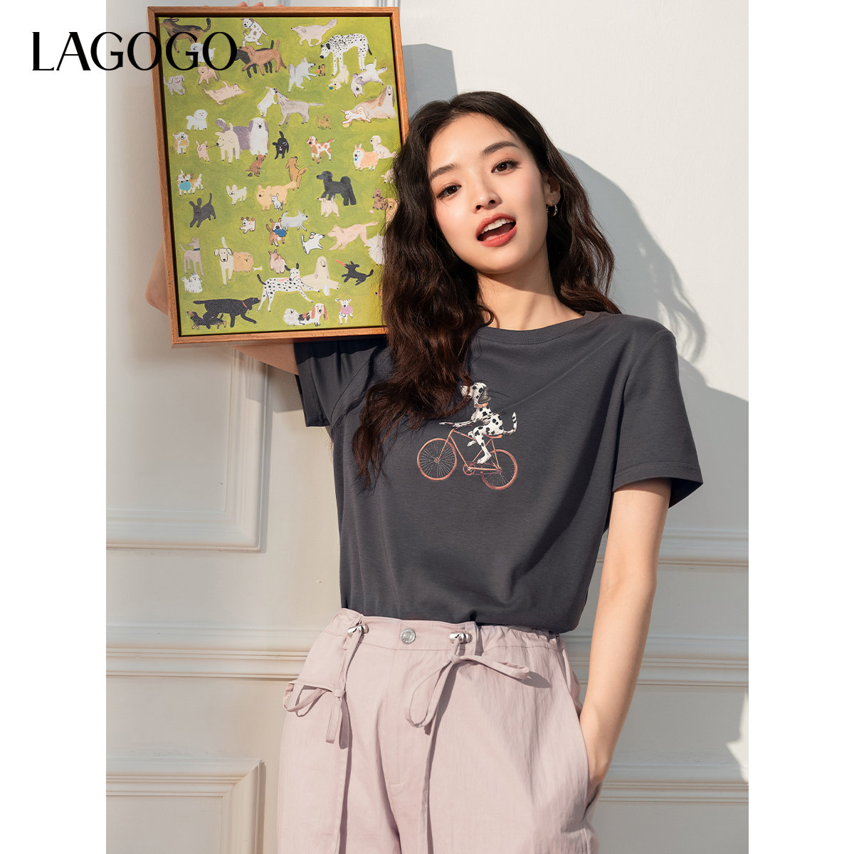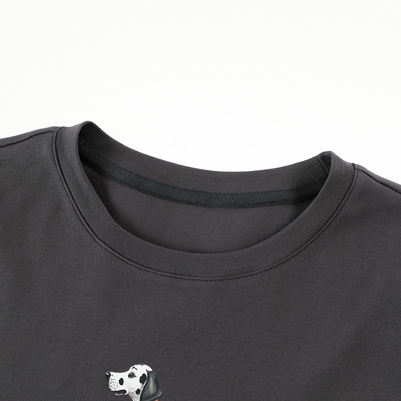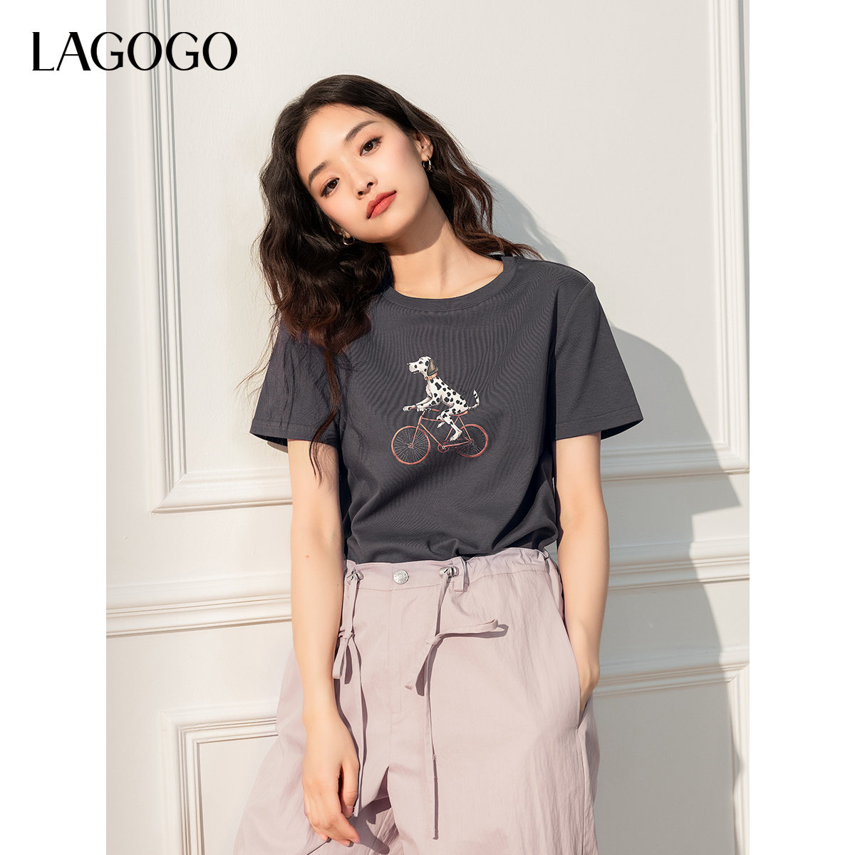 LAGOGO萌宠灰色T恤女拉谷谷春夏新款童趣印花圆领短袖上衣