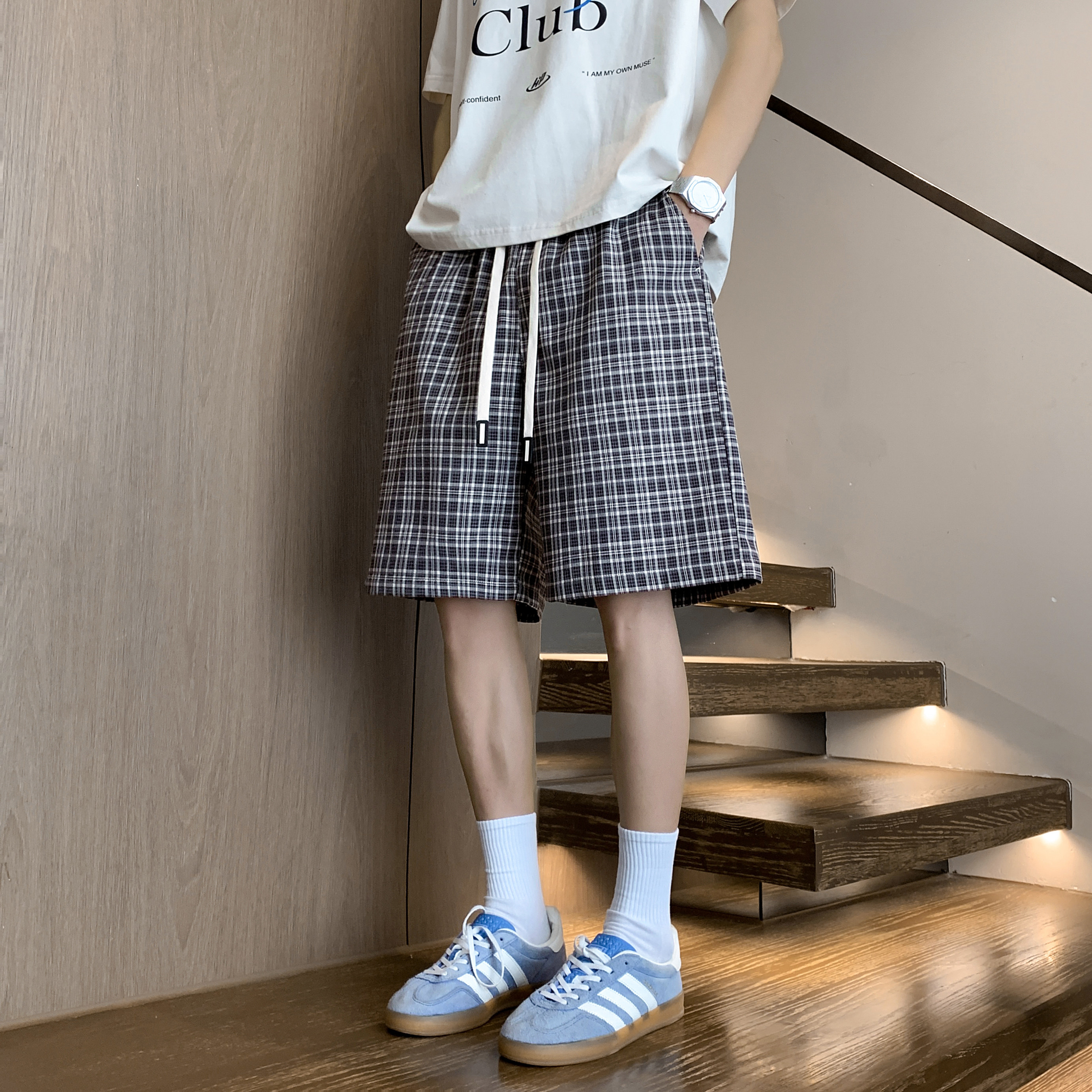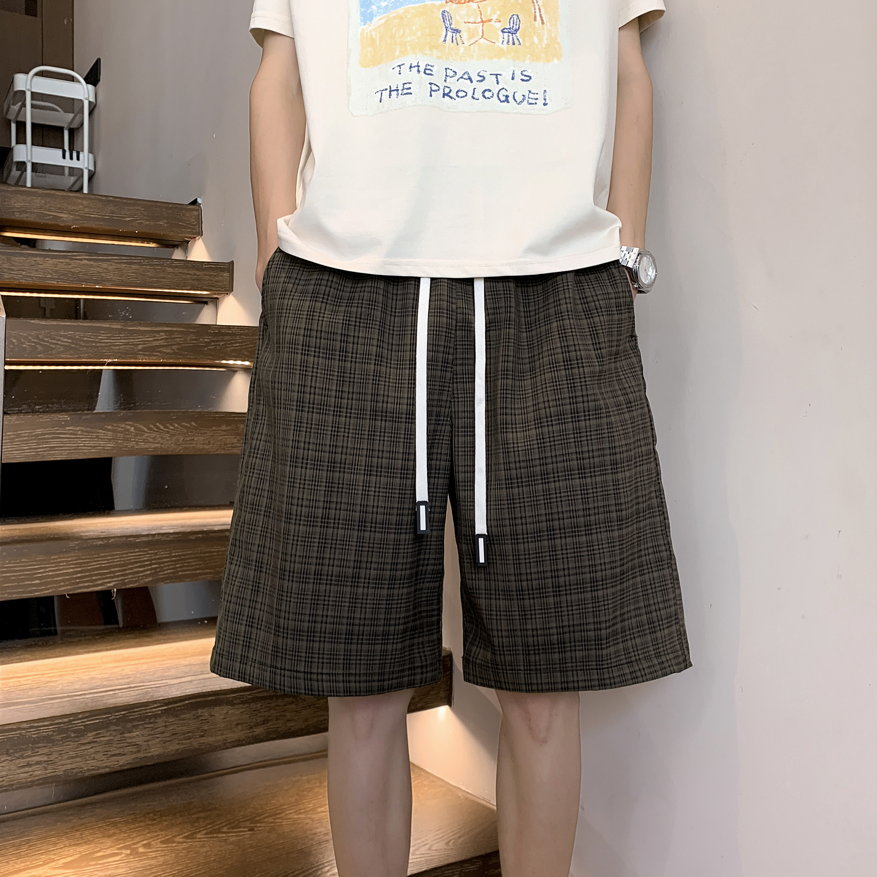 回力美式复古休闲格子短裤男夏季外穿宽松沙滩裤男生休闲五分裤子