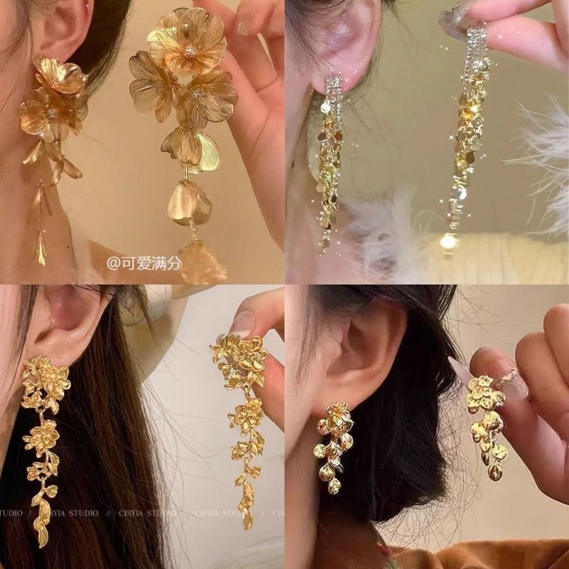 金色花朵流苏耳环长款新中式夸张圆脸耳夹女无耳洞气质耳饰耳坠