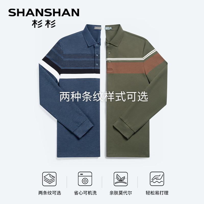 杉杉中年男士长袖T恤翻领2025春秋季新款休闲条纹上衣polo衫男款