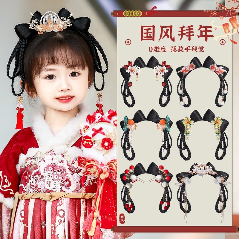 儿童汉服新年头饰假发包古装一体式发箍古风中国风年服女辫子发髻