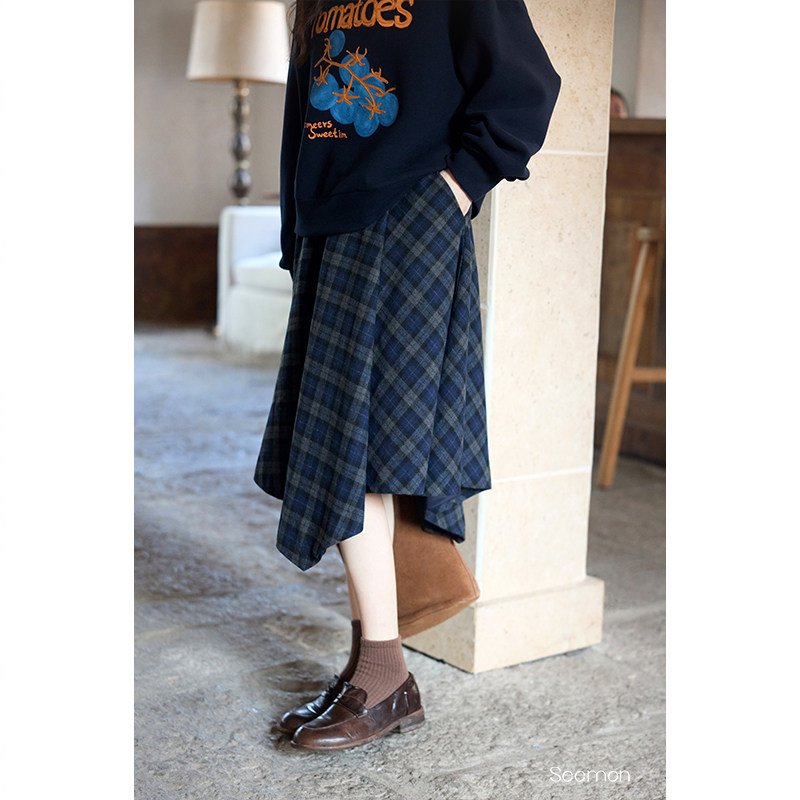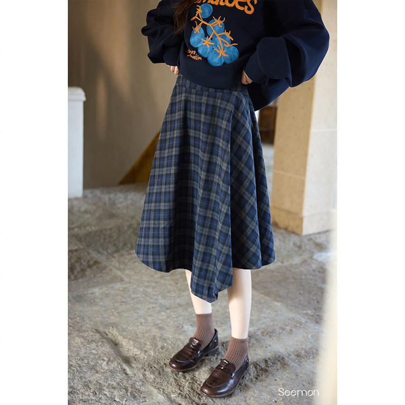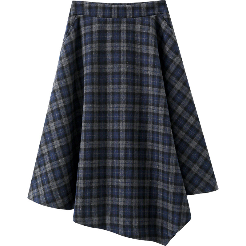夕蒙2025新款秋冬韩系气质裙子不规则设计感小众藏蓝格纹半身裙女