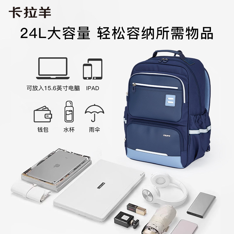 卡拉羊24L初中生书包高中生书包减负护脊超轻大容量多隔层男女生双肩包防下坠风琴书包