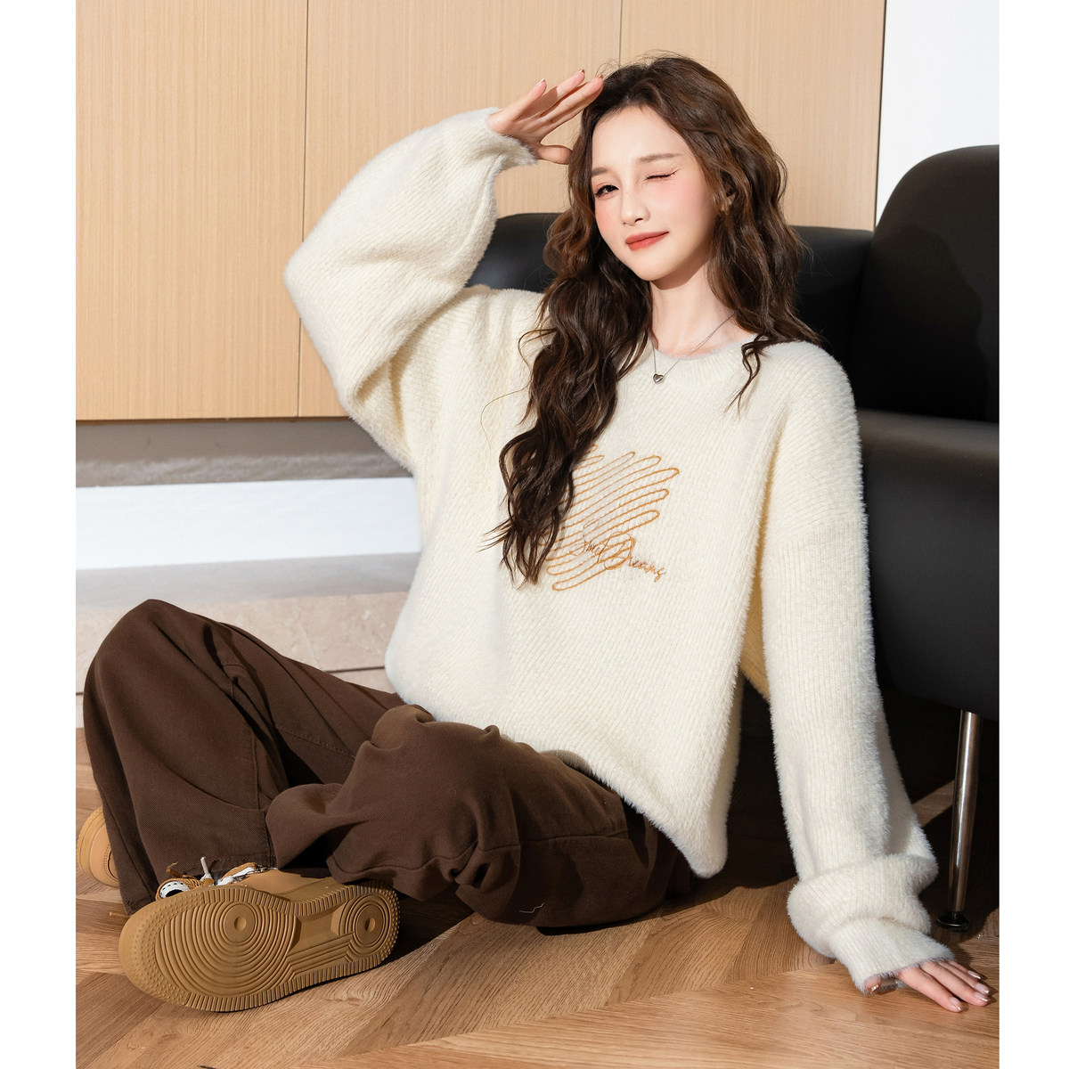 唐狮秋冬季新款圆领套头毛衣女甜美气质慵懒爱心宽松上衣TE